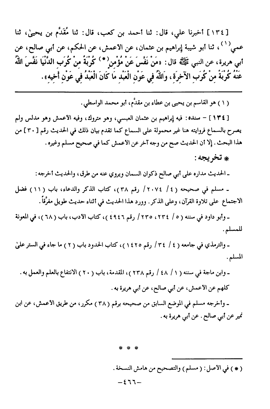 134 - أَخْبَرَنَا عَلِيٌّ قَالَ: ثنا أَحْمَدُ بْنُ كَعْبٍ, قَالَ: ثنا مُقَدَّمُ بْنُ يَحْيَى, ثنا عَمِّي, ثنا أَبُو شَيْبَةَ إِبْرَاهِيمُ بْنُ عُثْمَانَ, عَنِ الْأَعْمَشِ, عَنِ الْحَكَمِ, عَنْ أَبِي صَالِحٍ, عَنْ أَبِي هُرَيْرَةَ, عَنِ النَّبِيِّ صَلَّى اللهُ عَلَيْهِ وَسَلَّمَ قَالَ: §" مَنْ نَفَّسَ عَنْ مُؤْمِنٍ كُرْبَةً مِنْ كُرَبِ الدُّنْيَا نَفَّسَ اللَّهُ عَنْهُ كُرْبَةً مِنْ كُرَبِ الْآخِرَةِ, وَاللَّهُ فِي عَوْنِ الْعَبْدِ مَا كَانَ الْعَبْدُ فِي عَوْنِ أَخِيهِ "