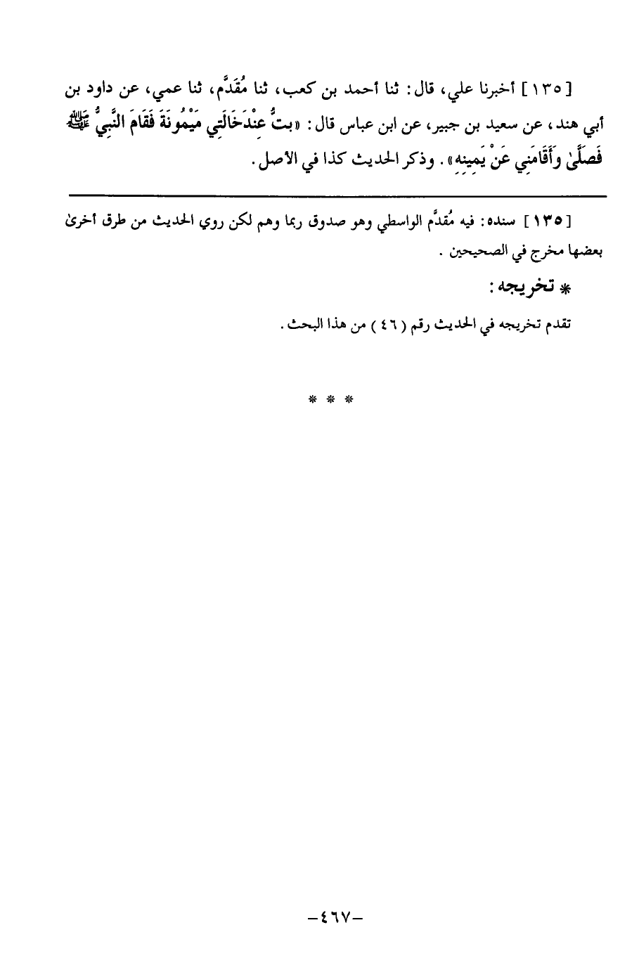 135 - أَخْبَرَنَا عَلِيٌّ قَالَ: ثنا أَحْمَدُ بْنُ كَعْبٍ, ثنا مُقَدَّمٌ, ثنا عَمِّي, عَنْ دَاوُدَ بْنِ أَبِي هِنْدَ, عَنْ سَعِيدِ بْنِ جُبَيْرٍ, عَنِ ابْنِ عَبَّاسٍ, قَالَ: بِتُّ عِنْدَ خَالَتِي مَيْمُونَةَ فَقَامَ النَّبِيُّ صَلَّى اللهُ عَلَيْهِ وَسَلَّمَ §فَصَلَّى وَأَقَامَنِي عَنْ يَمِينِهِ وَذَكَرَ الْحَدِيثَ كَذَا فِي الْأَصْلِ