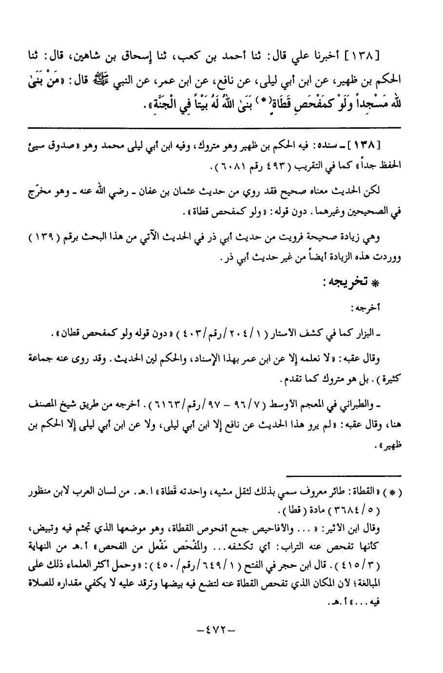 138 - أَخْبَرَنَا عَلِيٌّ قَالَ: ثنا أَحْمَدُ بْنُ كَعْبٍ, ثنا إِسْحَاقُ بْنُ شَاهِينٍ, قَالَ: ثنا الْحَكَمُ بْنُ ظُهَيْرٍ, عَنِ ابْنِ أَبِي لَيْلَى, عَنْ نَافِعٍ, عَنِ ابْنِ عُمَرَ, عَنِ النَّبِيِّ صَلَّى اللهُ عَلَيْهِ وَسَلَّمَ قَالَ: §" مَنْ بَنَى لِلَّهِ مَسْجِدًا وَلَوْ كَمَفْحَصِ قَطَاةٍ بَنَى اللَّهُ لَهُ بَيْتًا فِي الْجَنَّةِ "