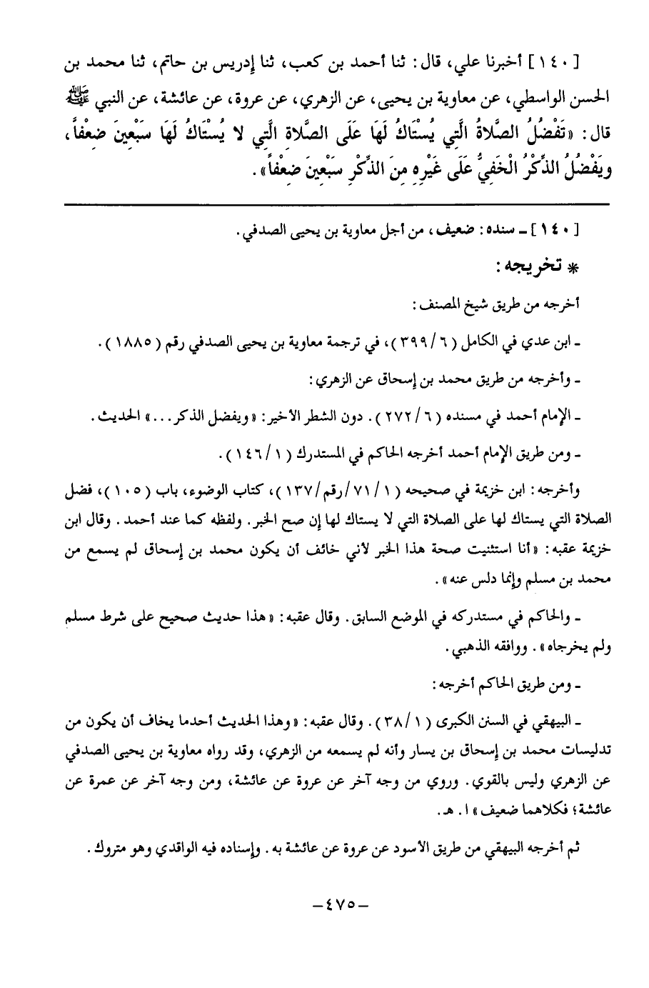 140 - أَخْبَرَنَا عَلِيٌّ قَالَ: ثنا أَحْمَدُ بْنُ كَعْبٍ, ثنا إِدْرِيسُ بْنُ حَاتِمٍ, ثنا مُحَمَّدُ بْنُ الْحَسَنِ الْوَاسِطِيُّ, عَنْ مُعَاوِيَةَ بْنِ يَحْيَى, عَنِ الزُّهْرِيِّ, عَنْ عُرْوَةَ, عَنْ عَائِشَةَ, عَنِ النَّبِيِّ صَلَّى اللهُ عَلَيْهِ وَسَلَّمَ قَالَ: §" تَفْضُلُ الصَّلَاةُ الَّتِي يُسْتَاكُ لَهَا عَلَى الصَّلَاةِ الَّتِي لَا يُسْتَاكُ لَهَا سَبْعِينَ ضِعْفًا, وَيَفْضُلُ الذِّكْرُ الْخَفِيُّ عَلَى غَيْرِهِ مِنَ الذِّكْرِ سَبْعِينَ ضِعْفًا "