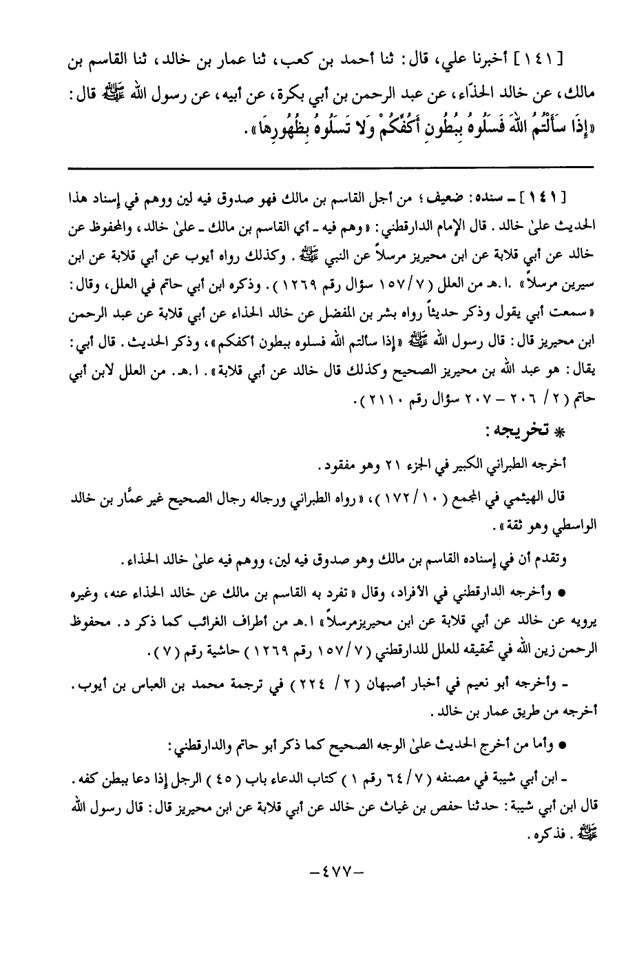 141 - أَخْبَرَنَا عَلِيٌّ قَالَ: ثنا أَحْمَدُ بْنُ كَعْبٍ, ثنا عَمَّارُ بْنُ خَالِدٍ, ثنا الْقَاسِمُ بْنُ مَالِكٍ, عَنْ خَالِدٍ الْحَذَّاءِ, عَنْ عَبْدِ الرَّحْمَنِ بْنِ أَبِي بَكْرَةَ, عَنْ أَبِيهِ, عَنْ رَسُولِ اللَّهِ صَلَّى اللهُ عَلَيْهِ وَسَلَّمَ قَالَ: §" إِذَا سَأَلْتُمُ اللَّهَ فَسَلُوهُ بِبُطُونِ أَكُفِّكُمْ وَلَا تَسَلُوهُ بِظُهُورِهَا "