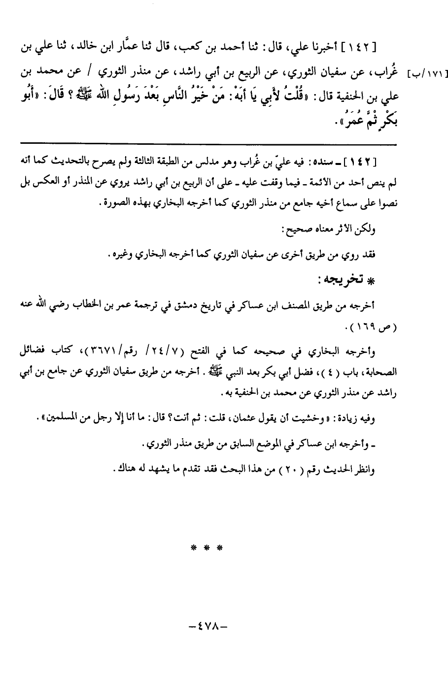142 - أَخْبَرَنَا عَلِيٌّ قَالَ: ثنا أَحْمَدُ بْنُ كَعْبٍ, قَالَ: ثنا عَمَّارُ بْنُ خَالِدٍ, ثنا عَلِيُّ بْنُ غُرَابٍ, عَنْ سُفْيَانَ الثَّوْرِيِّ, عَنِ الرَّبِيعِ بْنِ أَبِي رَاشِدٍ, عَنْ مُنْذِرٍ الثَّوْرِيِّ, عَنْ مُحَمَّدِ بْنِ عَلِيِّ ابْنِ الْحَنَفِيَّةَ, قَالَ: قُلْتُ لِأَبِي يَا أَبَهْ: §" مَنْ خَيْرُ النَّاسِ بَعْدَ رَسُولِ اللَّهِ صَلَّى اللهُ عَلَيْهِ وَسَلَّمَ؟ قَالَ: أَبُو بَكْرٍ ثُمَّ عُمَرُ "