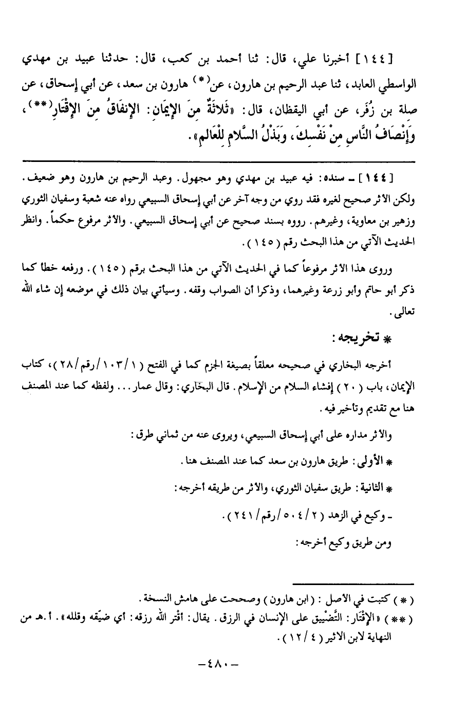 144 - أَخْبَرَنَا عَلِيٌّ قَالَ: ثنا أَحْمَدُ بْنُ كَعْبٍ, قَالَ: حَدَّثَنَا عُبَيْدُ بْنُ مَهْدِيٍّ الْوَاسِطِيُّ الْعَابِدُ, ثنا عَبْدُ الرَّحِيمِ بْنُ هَارُونَ, عَنْ هَارُونِ بْنِ سَعْدٍ, عَنْ أَبِي إِسْحَاقَ, عَنْ صِلَةَ بْنِ زُفَرٍ, عَنْ أَبِي الْيَقْظَانِ, قَالَ: " §ثَلَاثَةٌ مِنَ الْإِيمَانِ: الْإِنْفَاقُ مِنَ الْإِقْتَارِ, وَإِنْصَافُ النَّاسِ مِنْ نَفْسِكِ, وَبَذْلُ السَّلَامِ لِلْعَالَمِ "