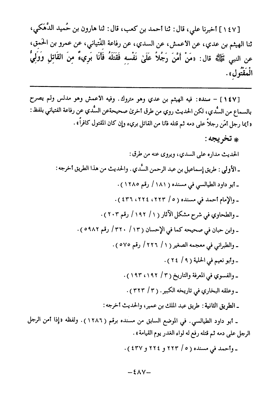 147 - أَخْبَرَنَا عَلِيٌّ قَالَ: ثنا أَحْمَدُ بْنُ كَعْبٍ, قَالَ: ثنا هَارُونُ بْنُ حُمَيْدٍ الدَّهْكِيُّ, ثنا الْهَيْثَمُ بْنُ عَدِيٍّ, عَنِ الْأَعْمَشِ, عَنِ السُّدِّيِّ, عَنْ رِفَاعَةَ الْفِتْيَانِيِّ, عَنْ عَمْرِو بْنِ الْحَمِقِ, عَنِ النَّبِيِّ صَلَّى اللهُ عَلَيْهِ وَسَلَّمَ قَالَ: §" مَنْ أَمَّنَ رَجُلًا عَلَى نَفْسِهِ فَقَتَلَهُ فَأَنَا بَرِيءٌ مِنَ الْقَاتِلِ وَوَلِيِّ الْمَقْتُولِ "