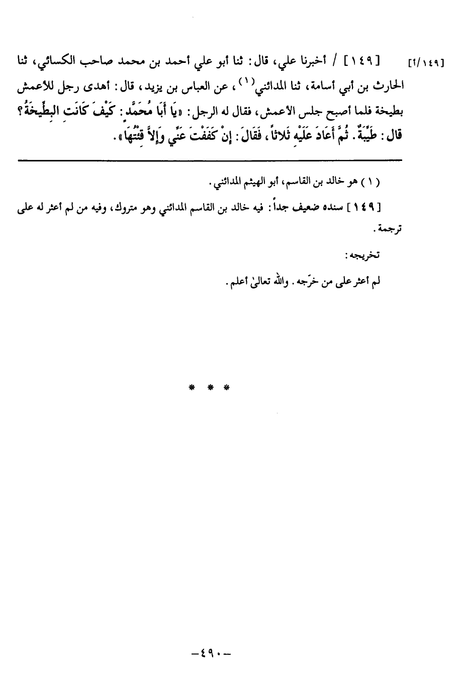 149 - أَخْبَرَنَا عَلِيٌّ قَالَ: ثنا أَبُو عَلِيٍّ أَحْمَدُ بْنُ مُحَمَّدٍ صَاحِبُ الْكِسَائِيِّ, ثنا الْحَارِثُ بْنُ أَبِي أُسَامَةَ, ثنا الْمَدَائِنِيُّ, عَنِ الْعَبَّاسِ بْنِ يَزِيدَ, قَالَ: أَهْدَى رَجُلٌ لِلْأَعْمَشِ بِطِّيخَةٌ فَلَمَّا أَصْبَحَ جَلَسَ الْأَعْمَشُ فَقَالَ لَهُ الرَّجُلُ: يَا أَبَا مُحَمَّدٍ: كَيْفَ كَانَتِ الْبِطِّيخَةُ؟ قَالَ: " طَيِّبَةٌ ", ثُمَّ أَعَادَ عَلَيْهِ ثَلَاثًا, فَقَالَ: §" إِنْ كَفَفْتَ عَنِّي وَإِلَّا قِئْتُهَا "