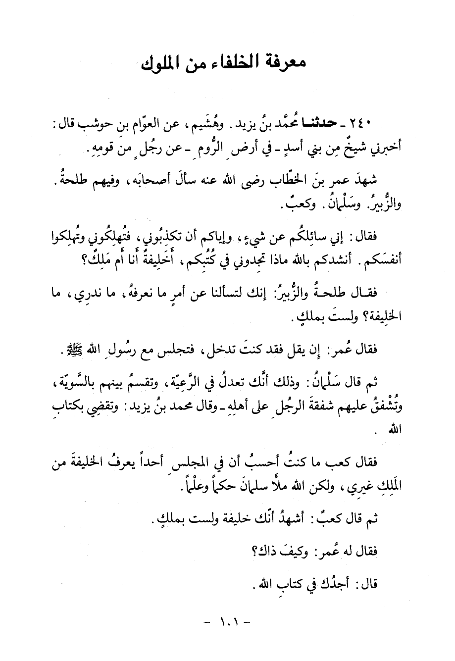 240 - حَدَّثَنَا مُحَمَّدُ بْنُ يَزِيدَ، وَهُشَيْمٌ، عَنِ الْعَوَّامِ بْنِ حَوْشَبٍ، قَالَ: أَخْبَرَنِي شَيْخٌ مِنْ بَنِي أَسَدٍ فِي أَرْضِ الرُّومِ، عَنْ رَجُلٍ، مِنْ قَوْمِهِ شَهِدَ عُمَرَ بْنَ الْخَطَّابِ رَضِيَ اللَّهُ عَنْهُ، سَأَلَ أَصْحَابَهُ وَفِيهِمْ طَلْحَةُ وَالزُّبَيْرُ وَسَلْمَانُ وَكَعْبٌ، فَقَالَ: «إِنِّي سَائِلُكُمْ عَنْ شَيْءٍ، وَإِيَّاكُمْ أَنْ تَكْذِبُونِي فَتُهْلِكُونِي وَتُهْلِكُوا أَنْفُسَكُمْ، أَنْشُدُكُمْ بِاللَّهِ مَاذَا تَجِدُونِي فِي كُتُبِكُمْ، §أَخَلِيفَةٌ أَنَا أَمْ مَلِكٌ؟» فَقَالَ طَلْحَةُ وَالزُّبَيْرُ: إِنَّكَ لَتَسْأَلُنَا عَنْ أَمْرٍ مَا نَعْرِفُهُ، مَا نَدْرِي مَا الْخَلِيفَةُ، وَلَسْتَ بِمَلِكٍ، فَقَالَ عُمَرُ: إِنْ يَقُلْ فَقَدْ كُنْتَ تَدْخُلُ فَتَجْلِسُ مَعَ رَسُولِ اللَّهِ صَلَّى اللهُ عَلَيْهِ وَسَلَّمَ، ثُمَّ قَالَ سَلْمَانُ: وَذَلِكَ أَنَّكَ تَعْدِلُ فِي الرَّعِيَّةِ، وَتُقْسِمُ بَيْنَهُمْ بِالسَّوِيَّةِ، وَتُشْفِقُ عَلَيْهِمْ شَفَقَةَ الرَّجُلِ عَلَى أَهْلِهِ، وَقَالَ مُحَمَّدُ بْنُ يَزِيدَ: وَتَقْضِي بِكِتَابِ اللَّهِ، فَقَالَ كَعْبٌ: مَا كُنْتُ أَحْسِبُ أَنَّ فِيَ الْمَجْلِسِ أَحَدًا يَعْرِفُ الْخَلِيفَةَ مِنَ الْمَلِكِ غَيْرِي، وَلَكِنَّ اللَّهَ مَلَأَ سَلْمَانَ حُكْمًا وَعِلْمًا، ثُمَّ قَالَ كَعْبٌ: أَشْهَدُ أَنَّكَ خَلِيفَةٌ وَلَسْتَ بِمَلِكٍ، فَقَالَ لَهُ عُمَرُ: «وَكَيْفَ ذَاكَ؟» قَالَ: أَجِدُكَ فِي كِتَابِ اللَّهِ -[102]-، قَالَ عُمَرُ: «تَجِدُنِي بِاسْمِي؟» قَالَ كَعْبٌ: لَا، وَلَكِنْ بِنَعْتِكَ، أَجِدُ نُبُوَّةً، ثُمَّ خِلَافَةً وَرَحْمَةً، وَقَالَ مُحَمَّدُ بْنُ يَزِيدَ: خِلَافَةٌ عَلَى مِنْهَاجِ نُبُوَّةٍ، ثُمَّ مُلْكًا عَضُوضًا قَالَ: وَقَالَ هُشَيْمٌ: وَجَبْرِيَّةٌ وَمُلْكًا عَضُوضًا، فَقَالَ عُمَرُ: «مَا أُبَالِي إِذَا جَاوَزَ ذَلِكَ رَأْسِي»