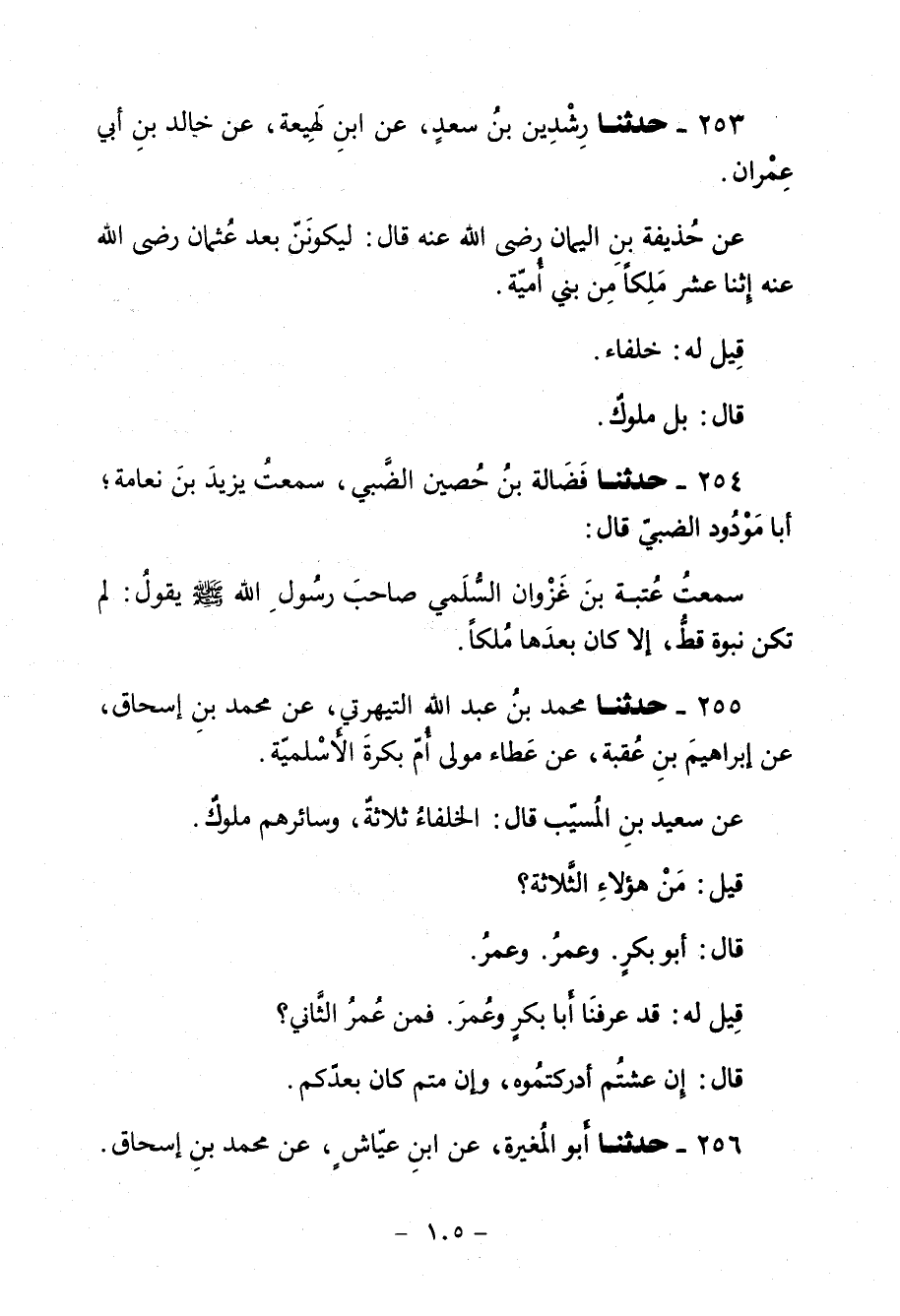 253 - حَدَّثَنَا رِشْدِينُ بْنُ سَعْدٍ، عَنِ ابْنِ لَهِيعَةَ، عَنْ خَالِدِ بْنِ أَبِي عِمْرَانَ، عَنِ حُذَيْفَةَ بْنِ الْيَمَانِ، رَضِيَ اللَّهُ عَنْهُ قَالَ: «§لَيَكُونَنَّ بَعْدَ عُثْمَانَ رَضِيَ اللَّهُ عَنْهُ اثْنَا عَشَرَ مَلِكًا مِنْ بَنِي أُمَيَّةَ» ، قِيلَ لَهُ،: خُلَفَاءُ؟ قَالَ: «بَلْ مُلُوكٌ»