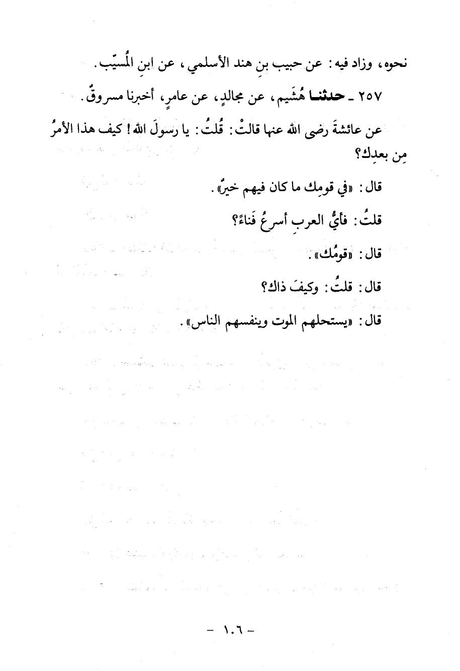257 - حَدَّثَنَا هُشَيْمٌ، عَنْ مُجَالِدٍ، عَنْ عَامِرٍ، أََنَا مَسْرُوقٌ، عَنْ عَائِشَةَ، رَضِيَ اللَّهُ عَنْهَا قَالَتْ: قُلْتُ: يَا رَسُولَ اللَّهِ، §كَيْفَ هَذَا الْأَمْرُ مِنْ بَعْدِكَ؟ قَالَ: «فِي قَوْمِكَ مَا كَانَ فِيهِمْ خَيْرٌ» قُلْتُ: فَأَيُّ الْعَرَبِ أَسْرَعُ فَنَاءً؟ قَالَ: «قَوْمُكَ» : قال قُلْتُ: وَكَيْفَ ذَاكَ؟ قَالَ: «يَسْتَحِلُّهُمُ الْمَوْتُ، وَيَنْفُسُهُمُ النَّاسُ»