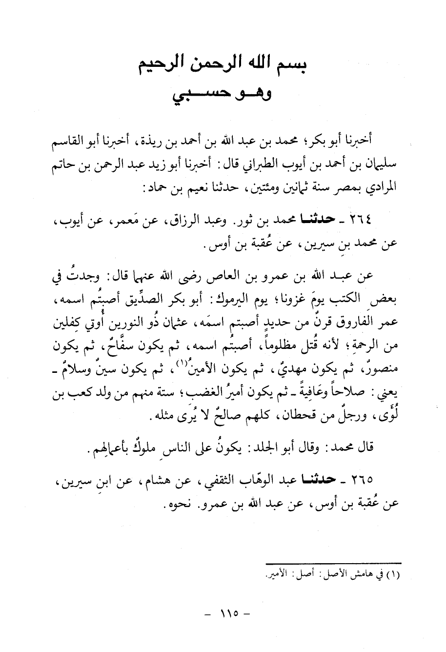 264 - حَدَّثَنَا مُحَمَّدُ بْنُ ثَوْرٍ، وَعَبْدُ الرَّزَّاقِ، عَنْ مَعْمَرٍ، عَنْ أَيُّوبَ، عَنْ مُحَمَّدِ بْنِ سِيرِينَ، عَنْ عُقْبَةَ بْنِ أَوْسٍ، عَنْ عَبْدِ اللَّهِ بْنِ عَمْرِو بْنِ الْعَاصِ، رَضِيَ اللَّهُ عَنْهُمَا قَالَ: وَجَدْتُ فِي بَعْضِ الْكُتُبِ: يَوْمَ غَزَوْنَا يَوْمَ الْيَرْمُوكِ «§أَبُو بَكْرٍ الصِّدِّيقُ أَصَبْتُمُ اسْمَهُ، عُمَرُ الْفَارُوقُ قَرْنٌ مِنْ حَدِيدٍ أَصَبْتُمُ اسْمَهُ، عُثْمَانُ ذُو النُّورَيْنِ أُوتِيَ كِفْلَيْنِ مِنَ الرَّحْمَةِ لِأَنَّهُ قُتِلَ مَظْلُومًا أَصَبْتُمُ اسْمَهُ، ثُمَّ يَكُونُ سَفَّاحٌ، ثُمَّ يَكُونُ مَنْصُورٌ، ثُمَّ يَكُونُ مَهْدِيُّ، ثُمَّ يَكُونُ الْأَمِينُ، ثُمَّ يَكُونُ سِينٌ وَسَلَامٌ، يَعْنِي صَلَاحًا وَعَافِيَةً، ثُمَّ يَكُونُ أَمِيرُ الْغَضَبِ، سِتَّةٌ مِنْهُمْ مِنْ وَلَدِ كَعْبِ بْنِ لُؤَيٍّ، وَرَجُلٌ مِنْ قَحْطَانَ، كُلُّهُمْ صَالِحٌ لَا يُرَى مِثْلُهُ» قَالَ مُحَمَّدٌ، وَقَالَ أَبُو الْجَلْدِ: «يَكُونُ عَلَى النَّاسِ مُلُوكٌ بِأَعْمَالِهِمْ» .