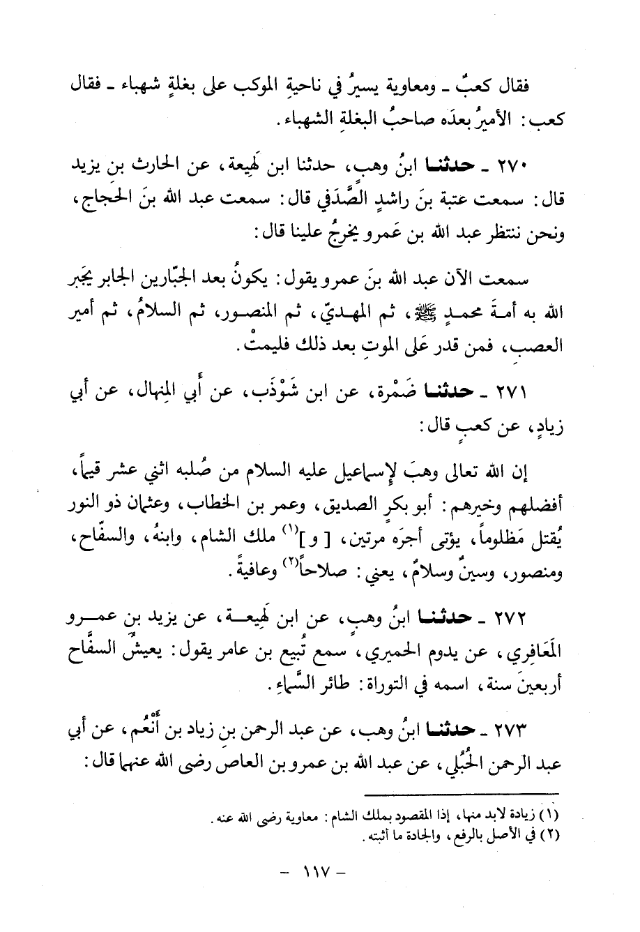271 - حَدَّثَنَا ضَمْرَةُ، عَنِ ابْنِ شَوْذَبٍ، عَنْ أَبِي الْمِنْهَالِ، عَنْ أَبِي زِيَادٍ، عَنْ كَعْبٍ، قَالَ: «إِنَّ §اللَّهَ تَعَالَى وَهَبَ لِإِسْمَاعِيلَ عَلَيْهِ السَّلَامُ مِنْ صُلْبِهِ اثْنَيْ عَشَرَ قَيِّمًا، أَفْضَلُهُمْ وَخَيْرُهُمْ أَبُو بَكْرٍ الصِّدِّيقُ، وَعُمَرُ بْنُ الْخَطَّابِ، وَعُثْمَانُ ذُو النُّورِ، يُقْتَلُ مَظْلُومًا، يُؤْتَى أَجْرَهُ مَرَّتَيْنِ، وَمَلِكُ الشَّامِ وَابْنُهُ، وَالسَّفَّاحُ، وَمَنْصُورٌ، وَسِينٌ وَسَلَامٌ، يَعْنِي صَلَاحًا وَعَافِيَةً»