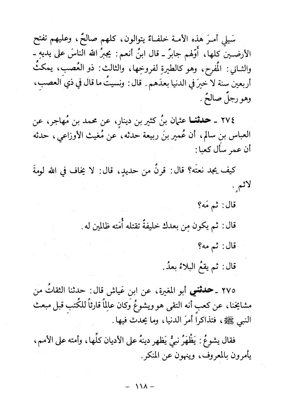 274 - حَدَّثَنَا عُثْمَانُ بْنُ كَثِيرِ بْنِ دِينَارٍ، عَنْ مُحَمَّدِ بْنِ مُهَاجِرٍ، عَنِ الْعَبَّاسِ بْنِ سَالِمٍ، أَنَّ عُمَيْرَ بْنَ رَبِيعَةَ حَدَّثَهُ، عَنْ مُغِيثٍ الْأَوْزَاعِيِّ، حَدَّثَهُ، أَنَّ عُمَرَ سَأَلَ كَعْبًا: كَيْفَ يَجِدُ نَعْتَهُ؟ قَالَ: «§قَرْنٌ مِنْ حَدِيدٍ» ، قَالَ: «لَا يَخَافُ فِي اللَّهِ لَوْمَةَ لَائِمٍ» قَالَ: ثُمَّ مَهْ؟ قَالَ: «ثُمَّ يَكُونُ مِنْ بَعْدِكَ خَلِيفَةٌ تَقْتُلُهُ أُمَّتُهُ ظَالِمِينَ لَهُ» ، قَالَ: ثُمَّ مَهْ؟ قَالَ: «ثُمَّ يَقَعُ الْبَلَاءُ بَعْدُ»