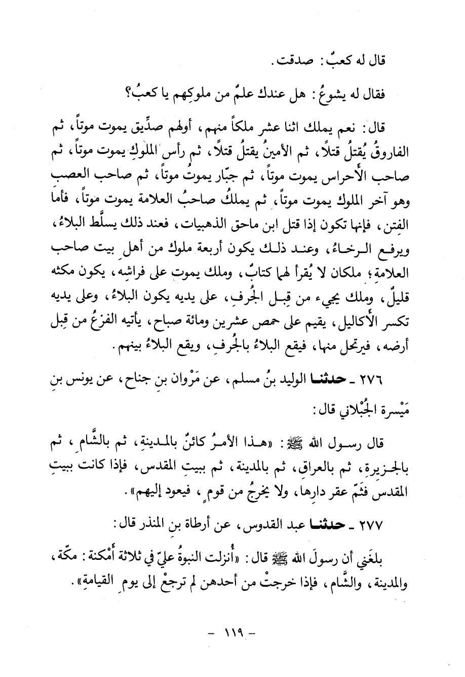 276 - حَدَّثَنَا الْوَلِيدُ بْنُ مُسْلِمٍ، عَنْ مَرْوَانَ بْنِ جَنَاحٍ، عَنْ يُونُسَ بْنِ مَيْسَرَةَ الْجُبْلَانِيِّ، قَالَ: قَالَ رَسُولُ اللَّهِ صَلَّى اللهُ عَلَيْهِ وَسَلَّمَ: «§هَذَا الْأَمْرُ كَائِنٌ بِالْمَدِينَةِ، ثُمَّ بِالشَّامِ، ثُمَّ بِالْجَزِيرَةِ، ثُمَّ بِالْعِرَاقِ، ثُمَّ بِالْمَدِينَةِ، ثُمَّ بِبَيْتِ الْمَقْدِسِ، فَإِذَا كَانَتْ بِبَيْتِ الْمَقْدِسِ فَثَمَّ عُقْرُ دَارِهَا، وَلَا يَخْرُجُ مِنْ قَوْمٍ فَيَعُودُ إِلَيْهِمْ»