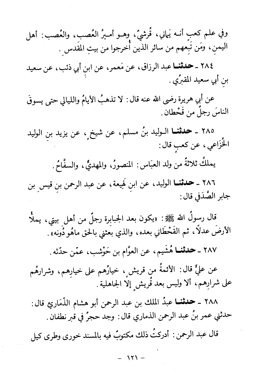 284 - حَدَّثَنَا عَبْدُ الرَّزَّاقِ، عَنْ مَعْمَرٍ، عَنِ ابْنِ أَبِي ذِئْبٍ، عَنْ سَعِيدِ بْنِ أَبِي سَعِيدٍ الْمَقْبُرِيِّ، عَنْ أَبِي هُرَيْرَةَ، رَضِيَ اللَّهُ عَنْهُ قَالَ: «§لَا تَذْهَبُ الْأَيَّامُ وَاللَّيَالِي حَتَّى يَسُوقَ النَّاسَ رَجُلٌ مِنْ قَحْطَانَ»