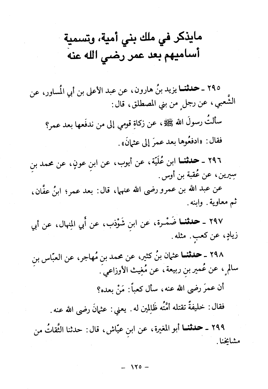 296 - حَدَّثَنَا ابْنُ عُلَيَّةَ، عَنْ أَيُّوبَ، عَنِ ابْنِ عَوْنٍ، عَنْ مُحَمَّدِ بْنِ سِيرِينَ، عَنْ عُقْبَةَ بْنِ أَوْسٍ، عَنْ عَبْدِ اللَّهِ بْنِ عَمْرٍو، رَضِيَ اللَّهُ عَنْهُمَا قَالَ: «§بَعْدَ عُمَرَ ابْنُ عَفَّانَ، ثُمَّ مُعَاوِيَةُ وَابْنُهُ»