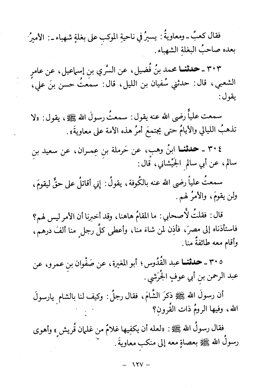 303 - حَدَّثَنَا مُحَمَّدُ بْنُ فُضَيْلٍ، عَنِ السَّرِيِّ بْنِ إِسْمَاعِيلَ، عَنْ عَامِرٍ الشَّعْبِيِّ، قَالَ: حَدَّثَنِي سُفْيَانُ بْنُ اللَّيْلِ، قَالَ: سَمِعْتُ حَسَنَ بْنَ عَلِيٍّ، يَقُولُ: سَمِعْتُ عَلِيًّا، رَضِيَ اللَّهُ عَنْهُ يَقُولُ: سَمِعْتُ رَسُولَ اللَّهِ صَلَّى اللهُ عَلَيْهِ وَسَلَّمَ يَقُولُ: «§لَا تَذْهَبُ اللَّيَالِي وَالْأَيَّامُ حَتَّى يَجْتَمِعَ أَمْرُ هَذِهِ الْأُمَّةِ عَلَى مُعَاوِيَةَ»