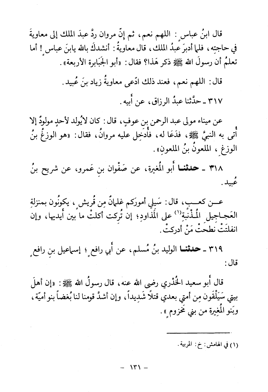 319 - حَدَّثَنَا الْوَلِيدُ بْنُ مُسْلِمٍ، عَنْ أَبِي رَافِعٍ إِسْمَاعِيلَ بْنِ رَافِعٍ قَالَ: قَالَ أَبُو سَعِيدٍ الْخُدْرِيُّ رَضِيَ اللَّهُ عَنْهُ: قَالَ رَسُولُ اللَّهِ صَلَّى اللهُ عَلَيْهِ وَسَلَّمَ: «إِنَّ §أَهْلَ بَيْتِي سَيَلْقَوْنَ مِنْ أُمَّتِي بَعْدِي قَتْلًا شَدِيدًا، وَإِنَّ أَشَدَّ قَوْمِنَا لَنَا بُغْضًا بَنُو أُمَيَّةَ، وَبَنُو الْمُغِيرَةِ مِنْ بَنِي مَخْزُومٍ»