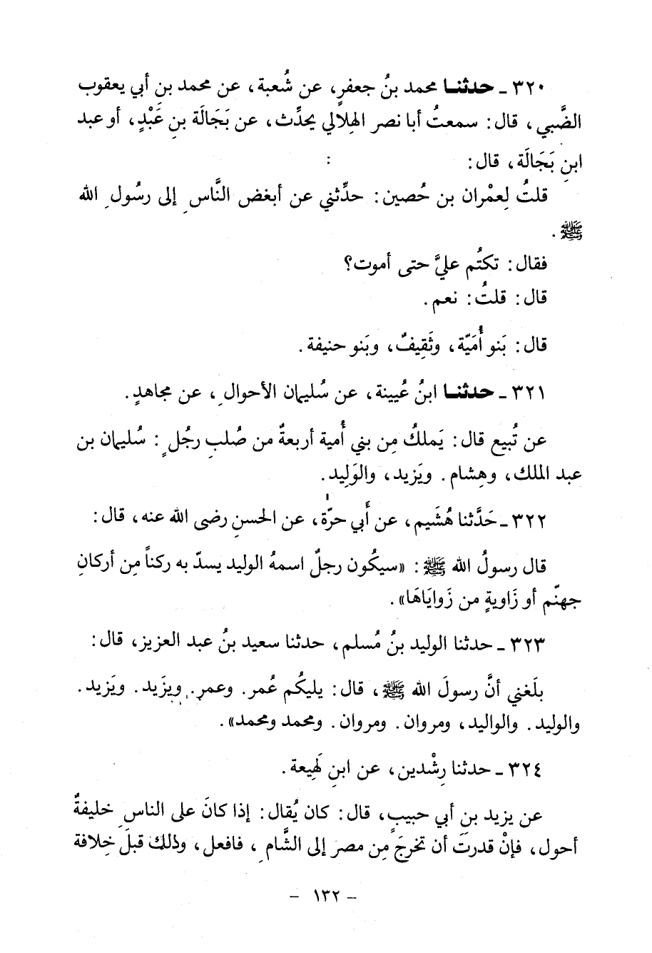 323 - حَدَّثَنَا الْوَلِيدُ بْنُ مُسْلِمٍ، حَدَّثَنَا سَعِيدُ بْنُ عَبْدِ الْعَزِيزِ، قَالَ: بَلَغَنِي أَنَّ رَسُولَ اللَّهِ صَلَّى اللهُ عَلَيْهِ وَسَلَّمَ قَالَ: «§يَلِيكُمْ عُمَرُ وَعُمَرُ، وَيَزِيدُ وَيَزِيدُ، وَالْوَلِيدُ وَالْوَلِيدُ، وَمَرْوَانُ وَمَرْوَانُ، وَمُحَمَّدٌ وَمُحَمَّدٌ»