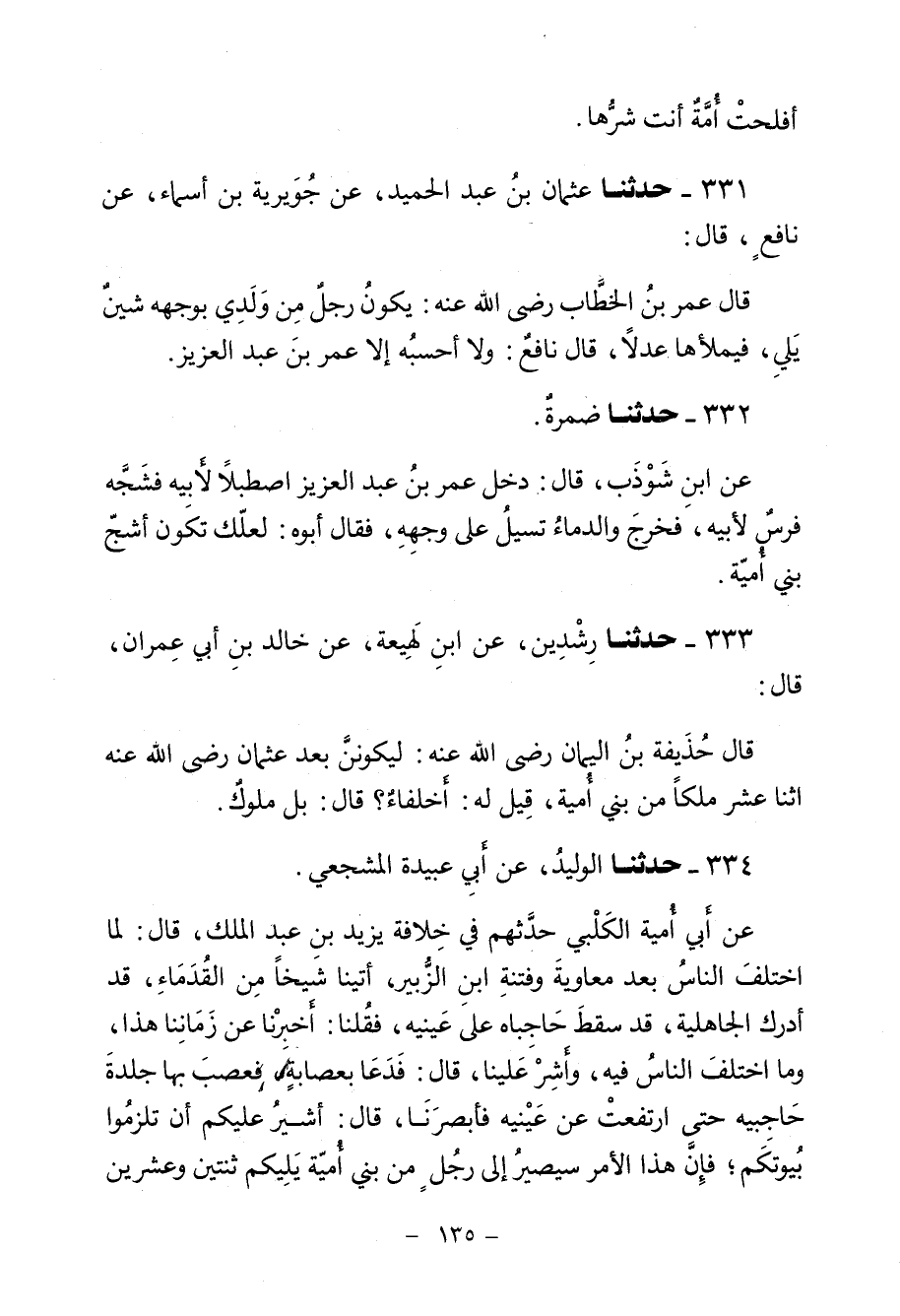 331 - حَدَّثَنَا عُثْمَانُ بْنُ عَبْدِ الْحَمِيدِ، عَنْ جُوَيْرِيَةَ بْنِ أَسْمَاءٍ، عَنْ نَافِعٍ، قَالَ: قالَ عُمَرُ بْنُ الْخَطَّابِ رَضِيَ اللَّهُ عَنْهُ: «§يَكُونُ رَجُلٌ مِنْ وَلَدِي بِوَجْهِهِ شَيْنٌ يَلِي فَيَمْلَأُهَا عَدْلًا» ، قَالَ نَافِعٌ: وَلَا أَحْسِبُهُ إِلَّا عُمَرَ بْنَ عَبْدِ الْعَزِيزِ