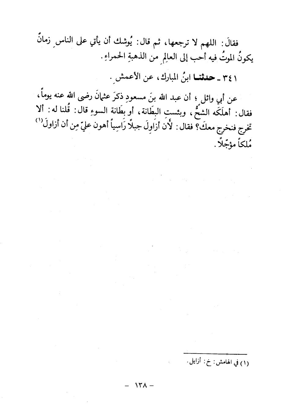 341 - حَدَّثَنَا ابْنُ الْمُبَارَكِ، عَنِ الْأَعْمَشِ، عَنْ أَبِي وَائِلٍ، أَنَّ عَبْدَ اللَّهِ بْنَ مَسْعُودٍ، ذَكَرَ عُثْمَانَ رَضِيَ اللَّهُ عَنْهُ يَوْمًا فَقَالَ: «§أَهْلَكَهُ الشُّحُّ، وَبِئْسَتِ الْبِطَانَةُ، أَوْ بِطَانَةُ السُّوءِ» ، قَالَ: قُلْنَا لَهُ: أَلَا تَخْرُجُ فَنَخْرُجَ مَعَكَ؟ فَقَالَ: «لَأَنْ أُزَاوِلَ جَبَلًا رَاسِيًا أَهْوَنُ عَلَيَّ مِنْ أَنْ أُزَاوِلَ مُلْكًا مُؤَجَّلًا»