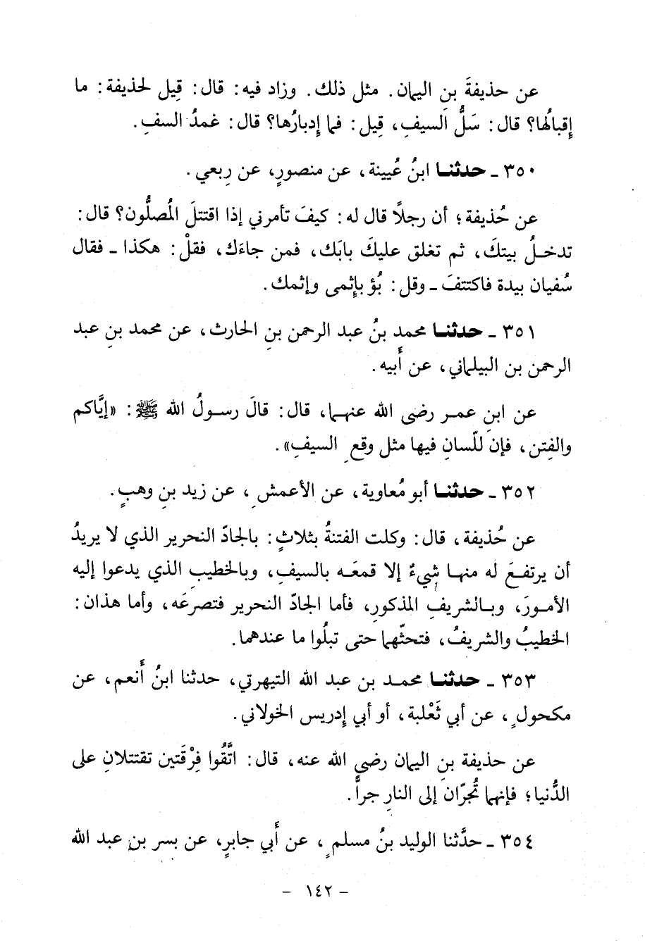 350 - حَدَّثَنَا ابْنُ عُيَيْنَةَ، عَنْ مَنْصُورٍ، عَنْ رِبْعِيٍّ، عَنْ حُذَيْفَةَ، أَنَّ رَجُلًا قَالَ لَهُ: §كَيْفَ تَأْمُرُنِي إِذَا اقْتَتَلَ الْمُصَلُّونَ؟ قَالَ: «تَدْخُلُ بَيْتَكَ، ثُمَّ تُغْلِقُ عَلَيْكَ بَابَكَ، فَمَنْ جَاءَكَ فَقُلْ هَكَذَا» فَقَالَ سُفْيَانُ بِيَدِهِ، فَاكْتَتِفْ وَقُلْ: «بُؤْ بِإِثْمِي وَإِثْمِكَ»