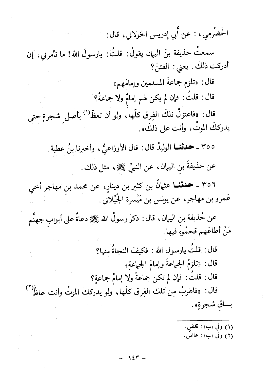 356 - حَدَّثَنَا عُثْمَانُ بْنُ كَثِيرِ بْنِ دِينَارٍ، عَنْ مُحَمَّدِ بْنِ مُهَاجِرٍ أَخِي عَمْرِو بْنِ مُهَاجِرٍ، عَنْ يُونُسَ بْنِ مَيْسَرَةَ الْجُبْلَانِيِّ، عَنْ حُذَيْفَةَ بْنِ الْيَمَانِ، قَالَ: ذَكَرَ رَسُولُ اللَّهِ صَلَّى اللهُ عَلَيْهِ وَسَلَّمَ دُعَاةً عَلَى أَبْوَابِ جَهَنَّمَ، مَنْ أَطَاعَهُمْ أَقَحَمُوهُ فِيهَا، قَالَ: قُلْتُ: يَا رَسُولَ اللَّهِ، فَكَيْفَ النَّجَاةُ مِنْهَا؟ قَالَ: «§تَلْزَمُ الْجَمَاعَةَ وَإِمَامَ الْجَمَاعَةِ» قَالَ: قُلْتُ: فَإِنْ لَمْ تَكُنْ جَمَاعَةٌ وَلَا إِمَامُ جَمَاعَةٍ؟ قَالَ: «فَاهْرُبْ مِنْ تِلْكَ الْفِرَقِ كُلِّهَا، وَلَوْ يُدْرِكُكَ الْمَوْتُ وَأَنْتَ عَاضٌّ بِسَاقِ شَجَرَةٍ»