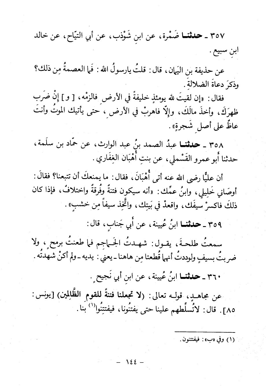 357 - حَدَّثَنَا ضَمْرَةُ، عَنِ ابْنِ شَوْذَبٍ، عَنْ أَبِي التَّيَّاحِ، عَنْ خَالِدِ بْنِ سُبَيْعٍ، عَنْ حُذَيْفَةَ بْنِ الْيَمَانِ، قَالَ: قُلْتُ: يَا رَسُولَ اللَّهِ، مَا الْعِصْمَةُ مِنْ ذَلِكَ؟، وَذَكَرَ دُعَاةَ الضَّلَالَةِ، فَقَالَ: «§إِنْ لَقِيتَ لِلَّهِ يَوْمَئِذٍ خَلِيفَةً فِي الْأَرْضِ فَالْزَمْهُ، وَإِنْ ضَرَبَ ظَهْرَكَ، وَأَخَذَ مَالَكَ، وَإِلَّا فَاهْرُبْ فِي الْأَرْضِ حَتَّى يَأْتِيَكَ الْمَوْتُ وَأَنْتَ عَاضٌّ عَلَى أَصْلِ شَجَرَةٍ»
