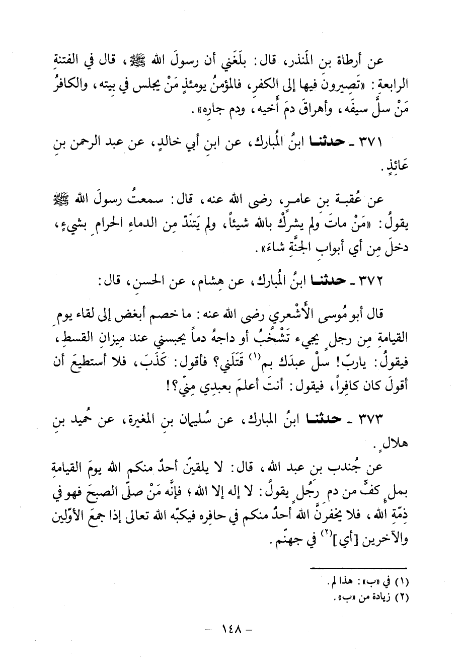 371 - حَدَّثَنَا ابْنُ الْمُبَارَكِ، عَنِ ابْنِ أَبِي خَالِدٍ، عَنْ عَبْدِ الرَّحْمَنِ بْنِ عَائِذٍ، عَنْ عُقْبَةَ بْنِ عَامِرٍ، رَضِيَ اللَّهُ عَنْهُ قَالَ: سَمِعْتُ رَسُولَ اللَّهِ صَلَّى اللهُ عَلَيْهِ وَسَلَّمَ يَقُولُ: «§مَنْ مَاتَ وَلَمْ يُشْرِكْ بِاللَّهِ شَيْئًا، وَلَمْ يَتَنَدَّ مِنَ الدِّمَاءِ الْحَرَامِ بِشَيْءٍ، دَخَلَ مِنْ أَيِّ أَبْوَابِ الْجَنَّةِ شَاءَ»