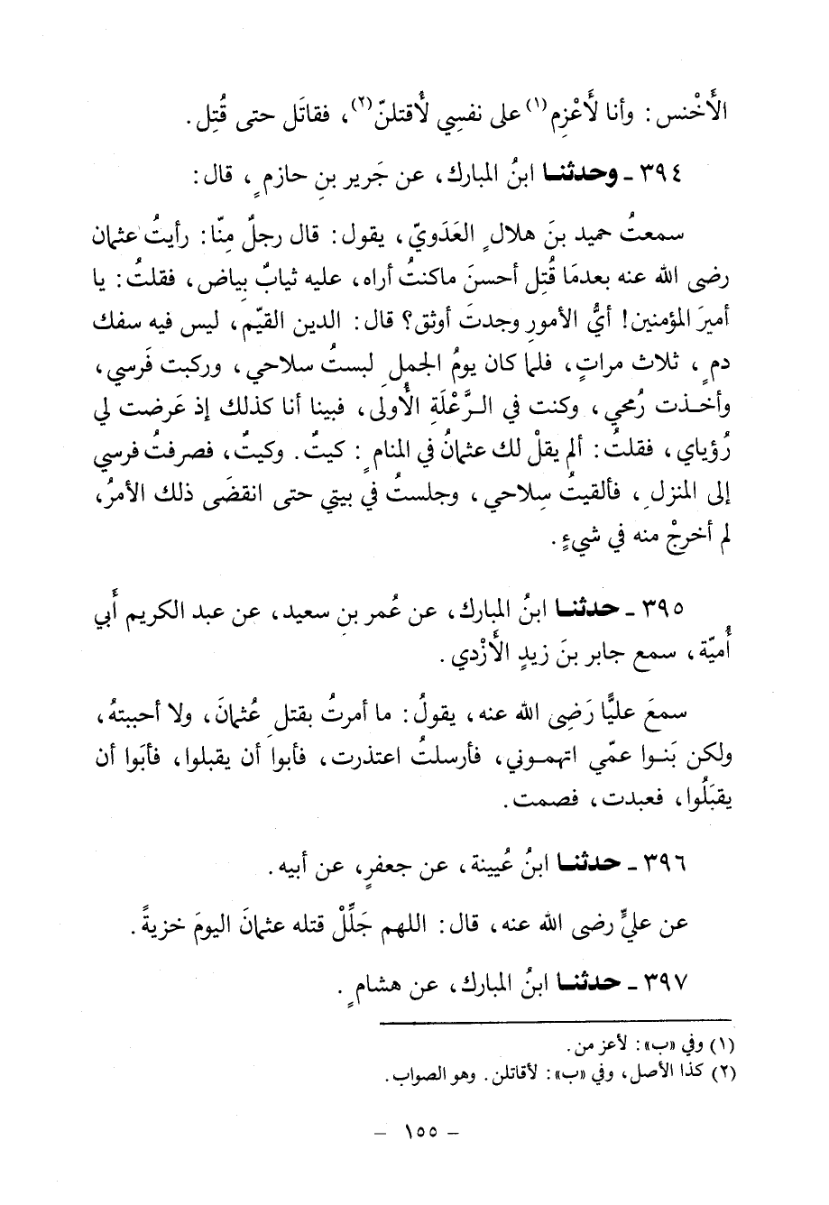 394 - وَحَدَّثَنَا ابْنُ الْمُبَارَكِ، عَنْ جَرِيرِ بْنِ حَازِمٍ، قَالَ: سَمِعْتُ حُمَيْدَ بْنَ هِلَالٍ الْعَدَوِيَّ، يَقُولُ: قَالَ رَجُلٌ مِنَّا: " رَأَيْتُ عُثْمَانَ رَضِيَ اللَّهُ عَنْهُ بَعْدَمَا قُتِلَ أَحْسَنَ مَا كُنْتُ أَرَاهُ، عَلَيْهِ ثِيَابٌ بَيَاضٌ، فَقُلْتُ: يَا أَمِيرَ الْمُؤْمِنِينَ، §أَيُّ الْأُمُورِ وَجَدْتَ أَوْثَقَ؟ قَالَ: الدِّينُ الْقَيِّمُ لَيْسَ فِيهِ سَفْكُ دَمٍ، ثَلَاثَ مَرَّاتٍ، فَلَمَّا كَانَ يَوْمُ الْجَمَلِ لَبِسْتُ سِلَاحِي، وَرَكِبْتُ فَرَسِي، وَأَخَذْتُ رُمْحِي، وَكُنْتُ فِي الرَّعْلَةِ الْأُولَى، فَبَيْنَا أَنَا كَذَلِكَ إِذْ عَرَضَتْ لِي رُؤْيَايَ، فَقُلْتُ: أَلَمْ يَقُلْ لَكَ عُثْمَانُ فِي الْمَنَامِ كَيْتَ وَكَيْتَ؟ فَصَرَفْتُ فَرَسِي إِلَى الْمَنْزِلِ، فَأَلْقَيْتُ سِلَاحِي، وَجَلَسْتُ فِي بَيْتِي حَتَّى انْقَضَى ذَلِكَ الْأَمْرُ، لَمْ أَخْرُجْ مِنْهُ فِي شَيْءٍ "