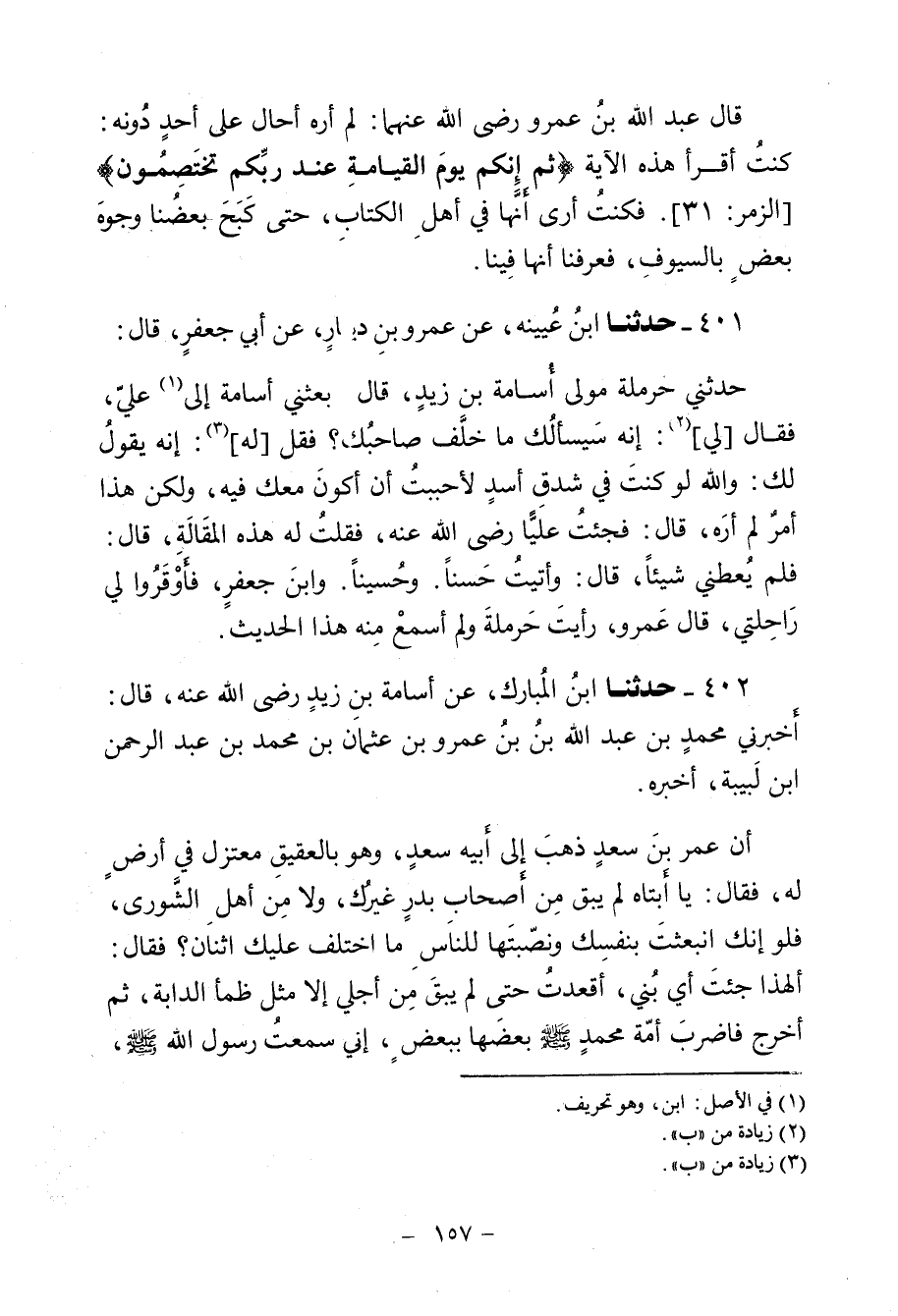 401 - حَدَّثَنَا ابْنُ عُيَيْنَةَ، عَنْ عَمْرِو بْنِ دِينَارٍ، عَنْ أَبِي جَعْفَرٍ، قَالَ: حَدَّثَنِي حَرْمَلَةُ مَوْلَى أُسَامَةَ بْنِ زَيْدٍ قَالَ: بَعَثَنِي أُسَامَةُ إِلَى عَلِيٍّ فَقَالَ: " إِنَّهُ سَيَسْأَلُكَ مَا خَلْفَ صَاحِبِكَ؟ فَقُلْ: إِنَّهُ يَقُولُ لَكَ: وَاللَّهِ §لَوْ كُنْتَ فِي شِدْقِ أَسَدٍ لَأَحْبَبْتُ أَنْ أَكُونَ مَعَكَ فِيهِ، وَلَكِنْ هَذَا أَمْرٌ لَمْ أَرَهْ "، قَالَ: فَجِئْتُ عَلِيًّا رَضِيَ اللَّهُ عَنْهُ فَقُلْتُ لَهُ هَذِهِ الْمَقَالَةَ، قَالَ: فَلَمْ يُعْطِنِي شَيْئًا، قَالَ: وَأَتَيْتُ حَسَنًا وَحُسَيْنًا وَابْنَ جَعْفَرٍ فَأَوْقَرُوا لِي رَاحِلَتِي قَالَ عَمْرٌو: رَأَيْتُ حَرْمَلَةَ وَلَمْ أَسْمَعْ مِنْهُ هَذَا الْحَدِيثَ