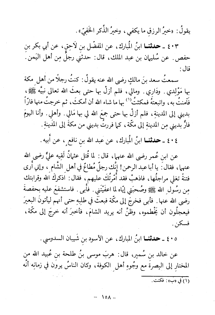 405 - حَدَّثَنَا ابْنُ الْمُبَارَكِ، عَنِ الْأَسْوَدِ بْنِ شَيْبَانَ السَّدُوسِيِّ، عَنْ خَالِدِ بْنِ سُمَيْرٍ، قَالَ: هَرَبَ مُوسَى بْنُ طَلْحَةَ بْنِ عُبَيْدِ اللَّهِ مِنَ الْمُخْتَارِ إِلَى الْبَصْرَةِ مَعَ وجُوهِ أَهْلِ الْكُوفَةِ، وَكَانَ النَّاسُ يَرَوْنَ فِي زَمَانِهِ أَنَّهُ الْمَهْدِيُّ، فَسَمِعْتُهُ يَوْمًا وَذَكَرَ الْفِتْنَةَ فَقَالَ: «رَحِمَ اللَّهُ عَبْدَ اللَّهِ بْنَ عُمَرَ، أَوْ أَبَا عَبْدِ الرَّحْمَنِ، وَاللَّهِ إِنِّي لَأَحْسِبُهُ عَلَى عَهْدِ النَّبِيِّ صَلَّى اللهُ عَلَيْهِ وَسَلَّمَ الَّذِي عَهِدَ إِلَيْهِ، §لَمْ يُفْتَنْ بَعْدَهُ، وَلَمْ يَتَغَيَّرْ، وَاللَّهِ مَا اسْتَفَزَّتْهُ قُرَيْشٌ فِي فِتْنَتِهَا الْأُولَى» فَقُلْتُ فِي نَفْسِي: إِنَّ هَذَا لَيُزْرِي عَلَى أَبِيهِ فِي مَقْتَلِهِ