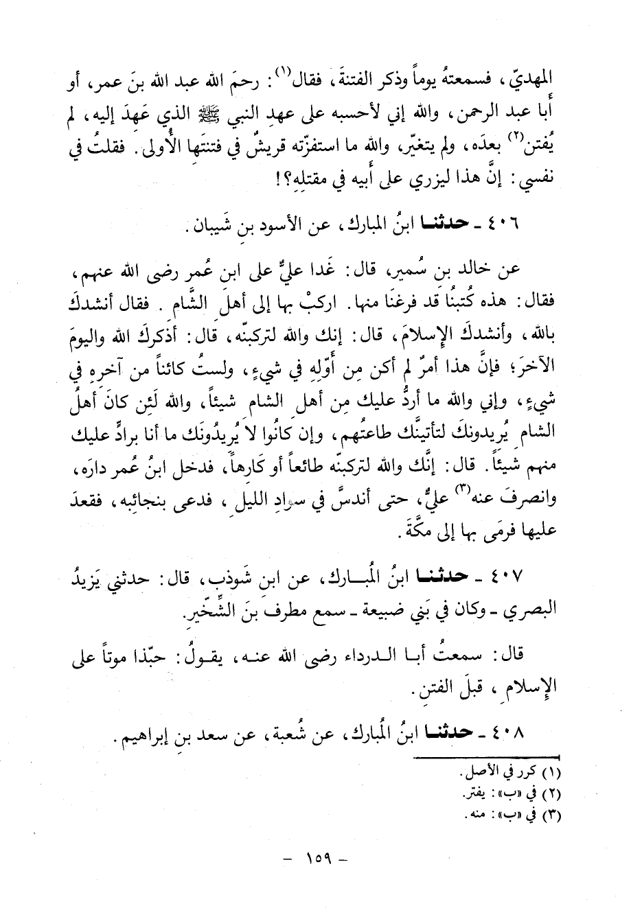 406 - حَدَّثَنَا ابْنُ الْمُبَارَكِ، عَنِ الْأَسْوَدِ بْنِ شَيْبَانَ، عَنْ خَالِدِ بْنِ سُمَيْرٍ، قَالَ: غَدَا عَلِيٌّ عَلَى ابْنِ عُمَرَ رَضِيَ اللَّهُ عَنْهُمْ فَقَالَ: «§هَذِهِ كُتُبُنَا قَدْ فَرَغْنَا مِنْهَا، ارْكَبْ بِهَا إِلَى أَهْلِ الشَّامِ» ، فَقَالَ: «أَنْشُدُكَ بِاللَّهِ، وَأَنْشُدُكَ الْإِسْلَامَ» ، قَالَ: «إِنَّكَ وَاللَّهِ لَتَرْكَبَنَّهُ» ، قَالَ: «أُذَكِّرُكَ اللَّهَ وَالْيَوْمَ الْآخِرَ، فَإِنَّ هَذَا أَمْرٌ لَمْ أَكُنْ مِنْ أَوَّلِهِ فِي شَيْءٍ، وَلَسْتُ كَائِنًا مِنْ آخِرِهِ فِي شَيْءٍ، وَإِنِّي وَاللَّهِ مَا أَرُدُّ عَلَيْكَ مِنْ أَهْلِ الشَّامِ شَيْئًا، وَاللَّهِ لَئِنْ كَانَ أَهْلُ الشَّامِ يُرِيدُونَكَ لَتَأْتِيَنَّكَ طَاعَتُهُمْ، وَإِنْ كَانُوا لَا يُرِيدُونَكَ مَا أَنَا بِرَادٍّ عَلَيْكَ مِنْهُمْ شَيْئًا» ، قَالَ: «إِنَّكَ وَاللَّهِ لَتَرْكَبَنَّهُ طَائِعًا أَوْ كَارِهًا» ، فَدَخَلَ ابْنُ عُمَرَ دَارَهُ وَانْصَرَفَ عَنْهُ عَلِيٌّ، حَتَّى انْدَسَّ فِي سَوَادِ اللَّيْلِ، فَدَعَا بِنَجَائِبِهِ، فَقَعَدَ عَلَيْهَا فَرَمَى بِهَا إِلَى مَكَّةَ