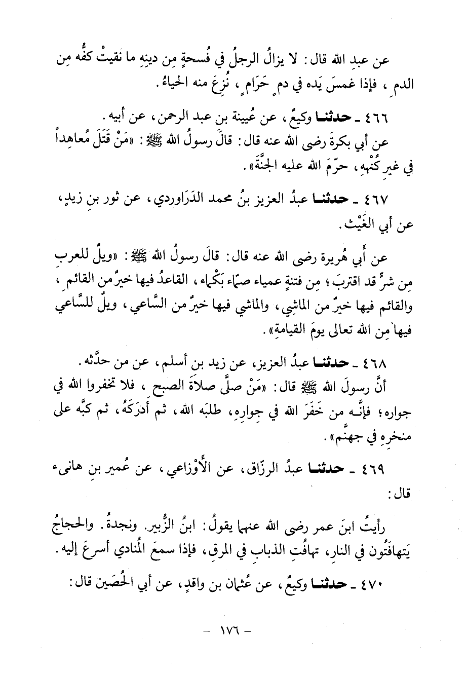 466 - حَدَّثَنَا وَكِيعٌ، عَنْ عُيَيْنَةَ بْنِ عَبْدِ الرَّحْمَنِ، عَنْ أَبِيهِ، عَنْ أَبِي بَكْرَةَ، رَضِيَ اللَّهُ عَنْهُ قَالَ: قَالَ رَسُولُ اللَّهِ صَلَّى اللهُ عَلَيْهِ وَسَلَّمَ: «§مَنْ قَتَلَ مُعَاهَدًا فِي غَيْرِ كُنْهِهِ حَرَّمَ اللَّهُ عَلَيْهِ الْجَنَّةَ»