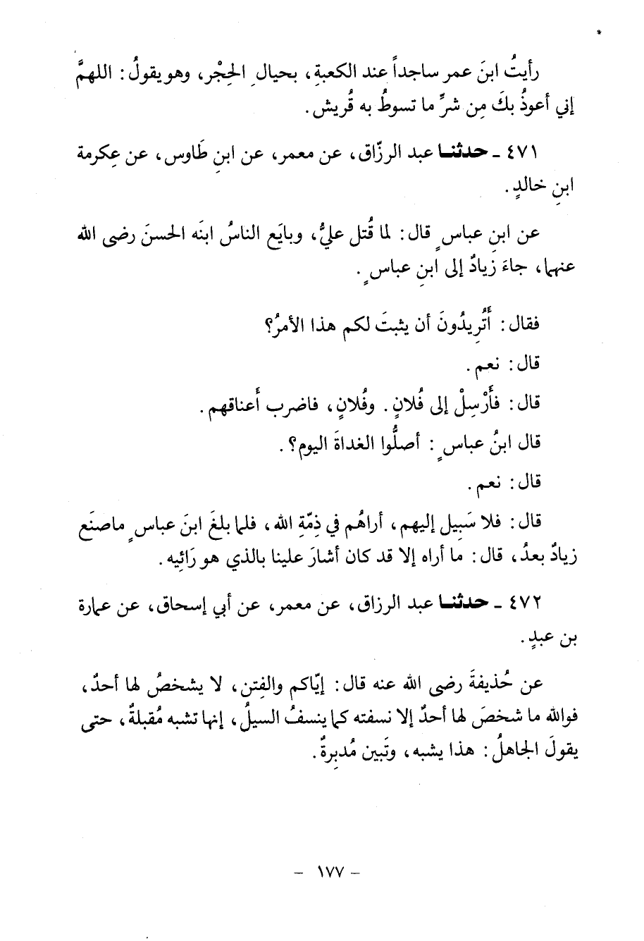 471 - حَدَّثَنَا عَبْدُ الرَّزَّاقِ، عَنْ مَعْمَرٍ، عَنِ ابْنِ طَاوُسٍ، عَنْ عِكْرِمَةَ بْنِ خَالِدٍ، عَنِ ابْنِ عَبَّاسٍ، قَالَ: لَمَّا قُتِلَ عَلِيٌّ وَبَايَعَ النَّاسُ ابْنَهُ الْحَسَنَ رَضِيَ اللَّهُ عَنْهُمَا جَاءَ زِيَادٌ إِلَى ابْنِ عَبَّاسٍ فَقَالَ: §أَتُرِيدُونَ أَنْ يَثْبُتَ لَكُمْ هَذَا الْأَمْرُ؟ قَالَ: «نَعَمْ» ، قَالَ: فَأَرْسِلْ إِلَى فُلَانٍ وَفُلَانٍ فَاضْرِبْ أَعْنَاقَهُمْ، قَالَ ابْنُ عَبَّاسٍ: «أَصَلَّوُا الْغَدَاةَ الْيَوْمَ؟» قَالَ: نَعَمْ، قَالَ: «فَلَا سَبِيلَ إِلَيْهِمْ، أُرَاهُمْ فِي ذِمَّةِ اللَّهِ» ، فَلَمَّا بَلَغَ ابْنَ عَبَّاسٍ مَا صَنَعَ زِيَادٌ بَعْدُ قَالَ: «مَا أَرَاهُ إِلَّا قَدْ كَانَ أَشَارَ عَلَيْنَا بِالَّذِي هُوَ رَآهُ»