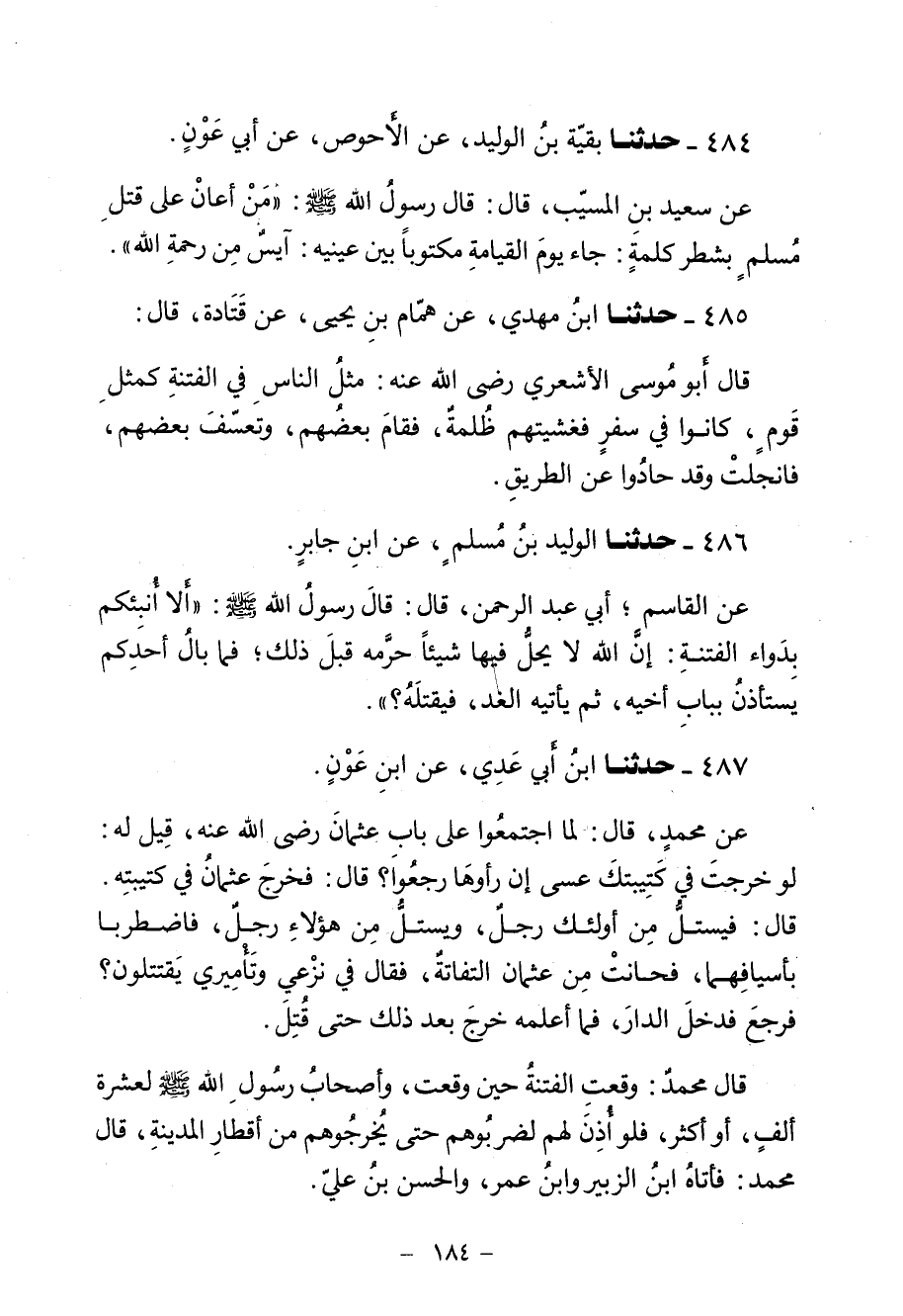487 - حَدَّثَنَا ابْنُ أَبِي عَدِيٍّ، عَنِ ابْنِ عَوْنٍ، عَنْ مُحَمَّدٍ، قَالَ: لَمَّا اجْتَمَعُوا عَلَى بَابِ عُثْمَانَ رَضِيَ اللَّهُ عَنْهُ قِيلَ لَهُ: لَوْ خَرَجْتَ فِي كَتِيبَتِكَ عَسَى إِنْ رَأَوْهَا رَجَعُوا؟ قَالَ: فَخَرَجَ عُثْمَانُ فِي كَتِيبَتِهِ، قَالَ: فَيَسْتَلُّ مِنْ أُولَئِكَ رَجُلٌ، وَيَسْتَلُّ مِنْ هَؤُلَاءِ رَجُلٌ، فَاضْطَرَبَا بِأَسْيَافِهِمَا فَحَانَتْ مِنْ عُثْمَانَ الْتِفَاتَةٌ، فَقَالَ: " §فِي نَزْعِي وَتَأْمِيرِي يَقْتَتِلُونَ؟ فَرَجَعَ فَدَخَلَ الدَّارَ، فَمَا أَعْلَمُهُ خَرَجَ بَعْدَ ذَلِكَ حَتَّى قُتِلَ قَالَ مُحَمَّدٌ: وَقَعَتِ الْفِتْنَةُ حِينَ وَقَعَتْ وَأَصْحَابُ رَسُولِ اللَّهِ صَلَّى اللهُ عَلَيْهِ وَسَلَّمَ لَعَشْرَةُ آلَاْفٍ أَوْ أَكْثَرُ، فَلَوْ أَذِنَ لَهُمْ لَضَرَبُوهُمْ حَتَّى يُخْرِجُوهُمْ مِنْ أَقْطَارِ الْمَدِينَةِ، قَالَ مُحَمَّدٌ: فَأَتَاهُ ابْنُ الزُّبَيْرِ، وَابْنُ عُمَرَ وَالْحَسَنُ بْنُ عَلِيٍّ -[185]-، قَالَ ابْنُ عَوْنٍ، وَقَالَ نَافِعٌ، لَبِسَ ابْنُ عُمَرَ الدِّرْعَ مَرَّتَيْنِ، وَنُبِّئْتُ أَنَّ أَبَا هُرَيْرَةَ كَانَ يُطِيفُ بِالدَّارِ فَيَقُولُ: أَمْ طَابَ أَمْ ضَرْبًا
