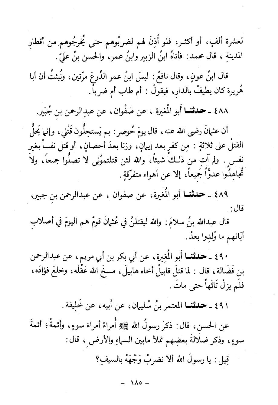 489 - حَدَّثَنَا أَبُو الْمُغِيرَةِ، عَنْ صَفْوَانَ، عَنْ عَبْدِ الرَّحْمَنِ بْنِ جُبَيْرٍ، قَالَ: قَالَ عَبْدُ اللَّهِ بْنُ سَلَامٍ: «وَاللَّهِ §لَيُقْتَلَنَّ فِي عُثْمَانَ قَوْمٌ هُمُ الْيَوْمَ فِي أَصْلَابِ آبَائِهِمْ مَا وُلِدُوا بَعْدُ»
