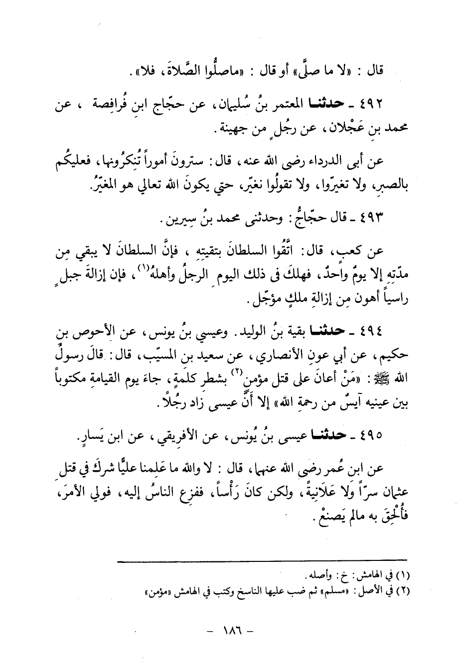 494 - حَدَّثَنَا بَقِيَّةُ بْنُ الْوَلِيدِ، وَعِيسَى بْنُ يُونُسَ، عَنِ الْأَحْوَصِ بْنِ حَكِيمٍ، عَنْ أَبِي عَوْنٍ الْأَنْصَارِيِّ، عَنْ سَعِيدِ بْنِ الْمُسَيِّبِ، قَالَ: قَالَ رَسُولُ اللَّهِ صَلَّى اللهُ عَلَيْهِ وَسَلَّمَ: " §مَنْ أَعَانَ عَلَى قَتْلِ مُسْلِمٍ بِشَطْرِ كَلِمَةٍ جَاءَ يَوْمَ الْقِيَامَةِ مَكْتُوبًا بَيْنَ عَيْنَيْهِ: آيسٌ مِنْ رَحْمَةِ اللَّهِ " إِلَّا أَنَّ عِيسَى زَادَ رَجُلًا