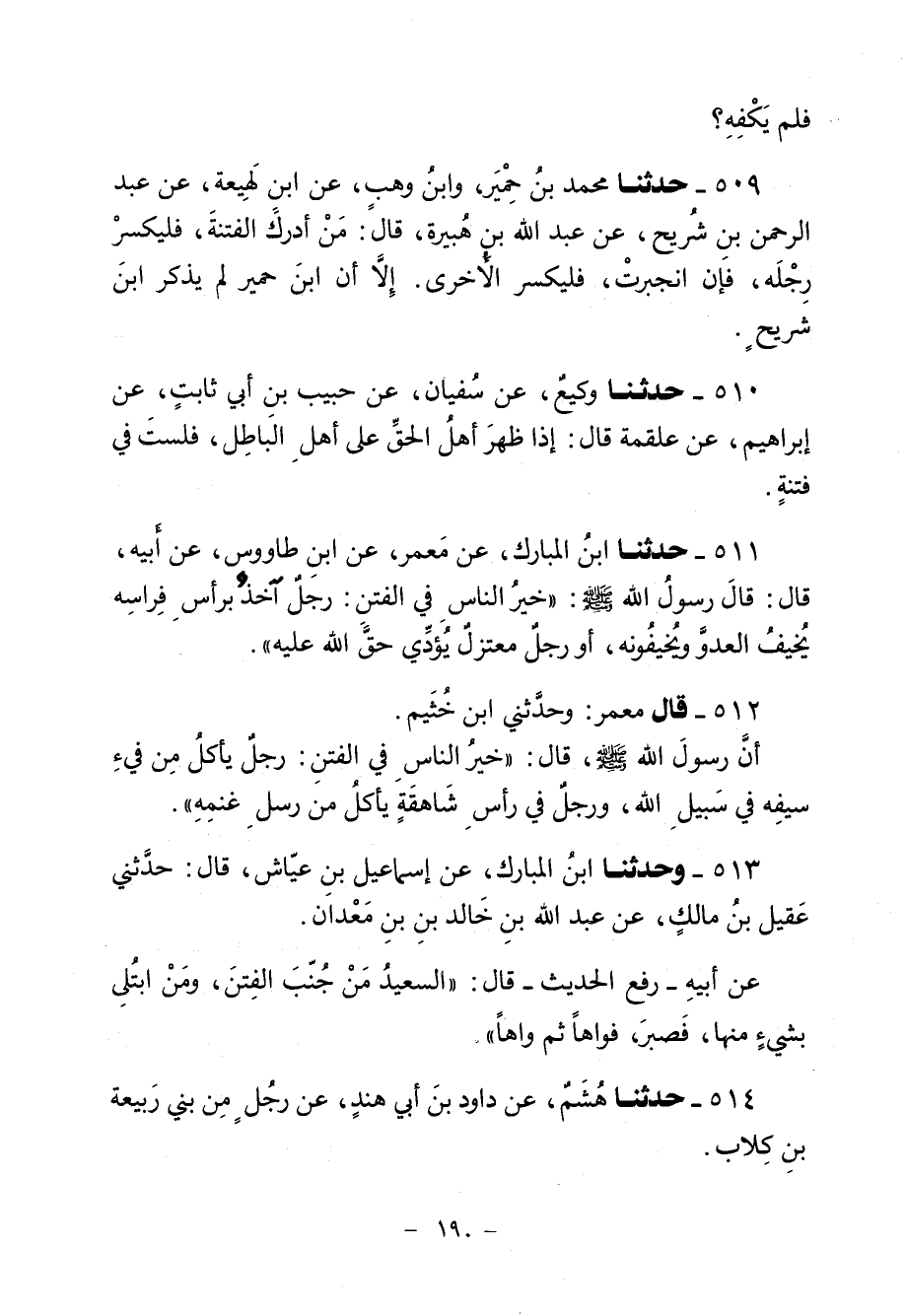 509 - حَدَّثَنَا مُحَمَّدُ بْنُ حِمْيَرَ، وَابْنُ وَهْبٍ، عَنِ ابْنِ لَهِيعَةَ، عَنْ عَبْدِ الرَّحْمَنِ بْنِ شُرَيْحٍ، عَنْ عَبْدِ اللَّهِ بْنِ هُبَيْرَةَ، قَالَ: «§مَنْ أَدْرَكَ الْفِتْنَةَ فَلْيَكْسَرْ رِجْلَهُ، فَإِنِ انْجَبَرَتْ فَلْيَكْسَرِ الْأُخْرَى» إِلَّا أَنَّ ابْنَ حِمْيَرَ لَمْ يَذْكُرِ ابْنَ شُرَيْحٍ