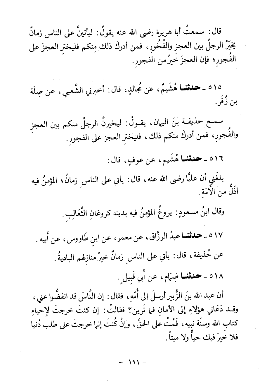 515 - حَدَّثَنَا هُشَيْمٌ، عَنْ مُجَالِدٍ، قَالَ: أَخْبَرَنَا الشَّعْبِيُّ، عَنْ صِلَةَ بْنِ زُفَرَ، سَمِعَ حُذَيْفَةَ بْنَ الْيَمَانِ، يَقُولُ: «§لَيُخَيَّرَنَّ الرَّجُلُ مِنْكُمْ بَيْنَ الْعَجْزِ وَالْفُجُورِ، فَمَنْ أَدْرَكَ مِنْكُمْ ذَلِكَ فَلْيَخْتَرِ الْعَجْزَ عَلَى الْفُجُورِ»
