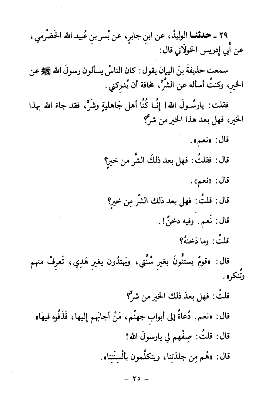 29 - حَدَّثَنَا الْوَلِيدُ، عَنِ ابْنِ جَابِرٍ، عَنْ بُسْرِ بْنِ عُبَيْدِ اللَّهِ الْحَضْرَمِيِّ، عَنْ أَبِي إِدْرِيسَ الْخَوْلَانِيِّ، قَالَ: سَمِعْتُ حُذَيْفَةَ بْنَ الْيَمَانِ، يَقُولُ: كَانَ النَّاسُ يَسْأَلُونَ رَسُولَ اللَّهِ صَلَّى اللهُ عَلَيْهِ وَسَلَّمَ عَنِ الْخَيْرِ، وَكُنْتُ §أَسْأَلُهُ عَنِ الشَّرِّ مَخَافَةَ أَنْ يُدْرِكَنِي، فَقُلْتُ: يَا رَسُولَ اللَّهِ، إِنَّا كُنَّا أَهْلَ جَاهِلِيَّةٍ وَشَرٍّ، فَقَدْ جَاءَ اللَّهُ بِهَذَا الْخَيْرِ، فَهَلْ بَعْدَ هَذَا الْخَيْرِ مِنْ شَرٍّ؟ قَالَ: «نَعَمْ» قَالَ: فَقُلْتُ: فَهَلْ بَعْدَ ذَلِكَ الشَّرِّ مِنْ خَيْرٍ؟ قَالَ: «نَعَمْ» قَالَ: قُلْتُ: فَهَلْ بَعْدَ ذَلِكَ الشَّرِّ مِنْ خَيْرٍ؟ قَالَ: «نَعَمْ، وَفِيهِ دَخَنٌ» قُلْتُ: وَمَا دَخَنُهُ؟ قَالَ: «قَوْمٌ يَسْتَنُّونَ بِغَيْرِ سُنَّتِي، وَيَهْتَدُونَ بِغَيْرِ هَدْيِ، تَعْرِفُ مِنْهُمْ وَتُنْكِرُ» قُلْتُ: فَهَلْ بَعْدَ ذَلِكَ الْخَيْرِ مِنْ شَرٍّ؟ قَالَ: «نَعَمْ، دُعَاةٌ إِلَى أَبْوَابِ جَهَنَّمَ، مَنْ أَجَابَهُمْ إِلَيْهَا قَذَفُوهُ فِيهَا» قَالَ: قُلْتُ: صِفْهُمْ لِي يَا رَسُولَ اللَّهِ؟ قَالَ: «هُمْ مِنْ جِلْدَتِنَا، وَيَتَكَلَّمُونَ بِأَلْسِنَتِنَا»