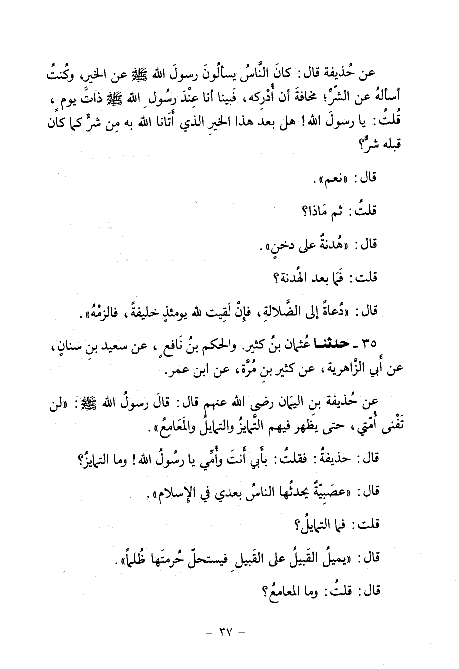 35 - حَدَّثَنَا عُثْمَانُ بْنُ كَثِيرٍ، وَالْحَكَمُ بْنُ نَافِعٍ، عَنْ سَعِيدِ بْنِ سِنَانٍ، عَنْ أَبِي الزَّاهِرِيَّةِ، عَنْ كَثِيرِ بْنِ مُرَّةَ، عَنِ ابْنِ عُمَرَ، عَنْ حُذَيْفَةَ بْنِ الْيَمَانِ، رَضِيَ اللَّهُ عَنْهُمْ قَالَ: قَالَ رَسُولُ اللَّهِ صَلَّى اللهُ عَلَيْهِ وَسَلَّمَ: «§لَنْ تَفْنَى أُمَّتِي حَتَّى يَظْهَرَ فِيهِمُ التَّمَايُزُ وَالتَّمَايُلُ وَالْمَعَامِعُ» قَالَ حُذَيْفَةُ: فَقُلْتُ: بِأَبِي أَنْتَ وَأُمِّي يَا رَسُولَ اللَّهِ، وَمَا التَّمَايُزُ؟ قَالَ: «عَصَبِيَّةٌ يُحْدِثُهَا النَّاسُ بَعْدِي فِي الْإِسْلَامِ» قُلْتُ: فَمَا التَّمَايُلُ؟ قَالَ: «يَمِيلُ الْقَبِيلُ عَلَى الْقَبِيلِ فَيَسْتَحِلُّ حُرْمَتَهَا ظُلْمًا» قَالَ: قُلْتُ: وَمَا الْمَعَامِعُ؟ -[38]- قَالَ: «مَسِيرُ الْأَمْصَارِ بَعْضُهَا إِلَى بَعْضٍ، فَتَخْتَلِفُ أَعْنَاقُهَا فِي الْحَرْبِ هَكَذَا» وَشَبَّكَ رَسُولُ اللَّهِ صَلَّى اللهُ عَلَيْهِ وَسَلَّمَ بَيْنَ أَصَابِعِهِ «وَذَلِكَ إِذَا فَسَدَتِ الْعَامَّةُ» ، يَعْنِي الْوُلَاةَ، «وَصَلُحَتِ الْخَاصَّةُ، طُوبَى لِامْرِئٍ أَصْلَحَ اللَّهُ خَاصَّتَهُ»