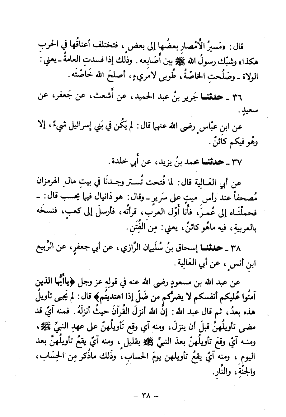 38 - حَدَّثَنَا إِسْحَاقُ بْنُ سُلَيْمَانَ الرَّازِيُّ، عَنْ أَبِي جَعْفَرٍ، عَنِ الرَّبِيعِ بْنِ أَنَسٍ، عَنْ أَبِي الْعَالِيَةِ، عَنْ عَبْدِ اللَّهِ بْنِ مَسْعُودٍ، رَضِيَ اللَّهُ عَنْهُ فِي قَوْلِهِ عَزَّ وَجَلَّ: {يَا أَيُّهَا الَّذِينَ آمَنُوا عَلَيْكُمْ أَنْفُسَكُمْ لَا يَضُرُّكُمُ مَنْ ضَلَّ إِذَا اهْتَدَيْتُمْ} [المائدة: 105] قَالَ: «لَمْ يَجِئْ تَأْوِيلُ هَذِهِ بَعْدُ» ، ثُمَّ قَالَ عَبْدُ اللَّهِ: «إِنَّ اللَّهَ أَنْزَلَ الْقُرْآنَ حَيْثُ أَنْزَلَهُ، §فَمِنْهُ آيٌ قَدْ مَضَى تَأْوِيلُهُنَّ قَبْلَ أَنْ يَنْزِلَ، وَمِنْهُ آيٌ وَقَعَ تَأْوِيلُهُنَّ عَلَى عَهْدِ النَّبِيِّ صَلَّى اللهُ عَلَيْهِ وَسَلَّمَ، وَمِنْهُ آيٌ وَقَعَ تَأْوِيلُهُنَّ بَعْدَ النَّبِيِّ صَلَّى اللهُ عَلَيْهِ وَسَلَّمَ بِقَلِيلٍ، وَمِنْهُ آيٌ يَقَعُ تَأْوِيلُهُنَّ بَعْدَ الْيَوْمِ، وَمِنْهُ آيٌ يَقَعُ تَأْوِيلُهُنَّ يَوْمَ الْحِسَابِ، وَذَلِكَ مَا ذُكِرَ مِنَ الْحِسَابِ وَالْجَنَّةِ وَالنَّارِ»
