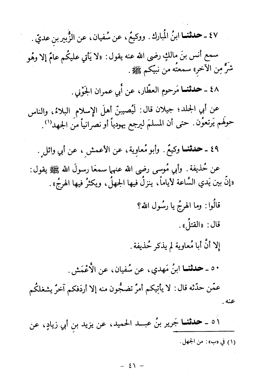 49 - حَدَّثَنَا وَكِيعٌ، وَأَبُو مُعَاوِيَةَ، عَنِ الْأَعْمَشِ، عَنْ أَبِي وَائِلٍ، عَنْ حُذَيْفَةَ، وَأَبِي مُوسَى، رَضِيَ اللَّهُ عَنْهُمَا، سَمِعَا رَسُولَ اللَّهِ صَلَّى اللهُ عَلَيْهِ وَسَلَّمَ يَقُولُ: «إِنَّ §بَيْنَ يَدَيِ السَّاعَةِ لَأَيَّامًا يَنْزِلُ فِيهَا الْجَهْلُ، وَيَكْثُرُ فِيهَا الْهَرْجُ» قَالُوا: وَمَا الْهَرْجُ يَا رَسُولَ اللَّهِ؟ قَالَ: «الْقَتْلُ» إِلَّا أَنَّ أَبَا مُعَاوِيَةَ لَمْ يَذْكُرْ حُذَيْفَةَ