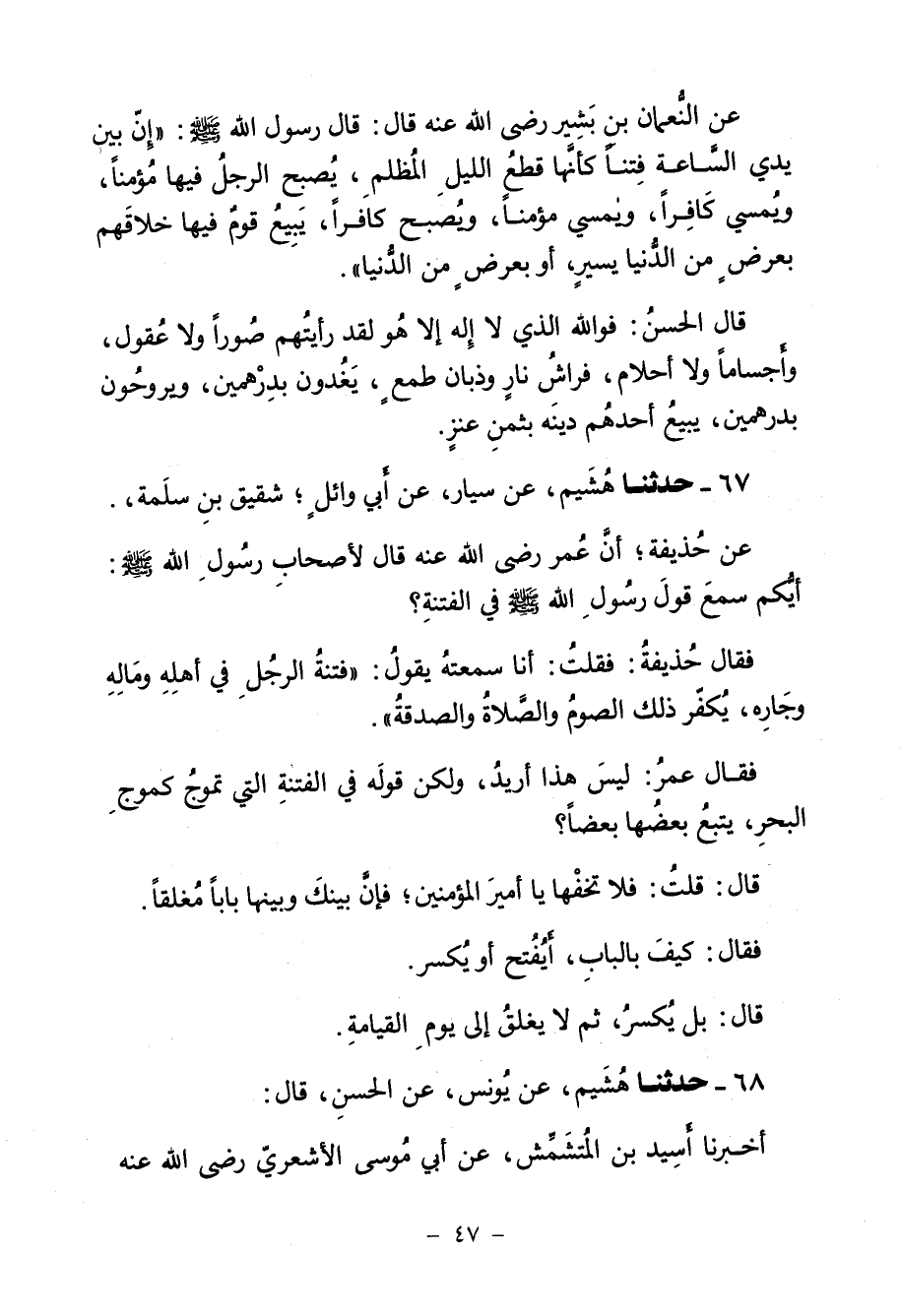 67 - حَدَّثَنَا هُشَيْمٌ، عَنْ سَيَّارٍ، عَنْ أَبِي وَائِلٍ شَقِيقِ بْنِ سَلَمَةَ، عَنْ حُذَيْفَةَ، أَنَّ عُمَرَ، رَضِيَ اللَّهُ عَنْهُ قَالَ لِأَصْحَابِ رَسُولِ اللَّهِ صَلَّى اللهُ عَلَيْهِ وَسَلَّمَ: أَيُّكُمْ سَمِعَ قَوْلَ رَسُولِ اللَّهِ صَلَّى اللهُ عَلَيْهِ وَسَلَّمَ فِي الْفِتْنَةِ؟ فَقَالَ حُذَيْفَةُ: فَقُلْتُ: أَنَا سَمِعْتُهُ يَقُولُ: «§فِتْنَةُ الرَّجُلِ فِي أَهْلِهِ، وَمَالِهِ، وَجَارِهِ، يُكَفِّرُ ذَلِكَ الصَّوْمُ، وَالصَّلَاةُ، وَالصَّدَقَةُ» ، فَقَالَ عُمَرُ: لَيْسَ هَذَا أُرِيدُ، وَلَكِنْ قَوْلَهُ فِي الْفِتْنَةِ الَّتِي تَمُوجُ كَمَوْجِ الْبَحْرِ يَتْبَعُ بَعْضُهَا بَعْضًا، قَالَ: قُلْتُ: فَلَا تَخَفْهَا يَا أَمِيرَ الْمُؤْمِنِينَ، فَإِنَّ بَيْنَكَ وَبَيْنَهَا بَابًا مُغْلَقًا، فَقَالَ: كَيْفَ بِالْبَابِ، أَيُفْتَحُ أَوْ يُكْسَرُ؟ قَالَ: بَلْ يُكْسَرُ، ثُمَّ لَا يُغْلَقُ إِلَى يَوْمِ الْقِيَامَةِ