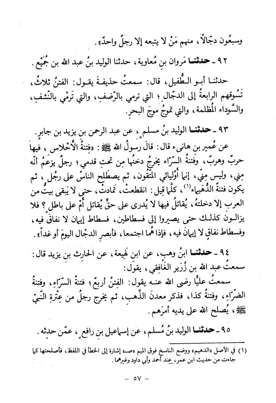 92 - حَدَّثَنَا مَرْوَانُ بْنُ مُعَاوِيَةَ، حَدَّثَنَا الْوَلِيدُ بْنُ عَبْدِ اللَّهِ بْنِ جُمَيْعٍ، حَدَّثَنَا أَبُو الطُّفَيْلِ، قَالَ: سَمِعْتُ حُذَيْفَةَ، يَقُولُ: «§الْفِتَنُ ثَلَاثٌ، تَسُوقُهُمُ الرَّابِعَةُ إِلَى الدَّجَّالِ الَّتِي تَرْمِي بِالرَّضْفِ، وَالَّتِي تَرْمِي بَالنَّشَفِ، وَالسَّوْدَاءُ الْمُظْلِمَةُ، وَالَّتِي تَمُوجُ مَوْجَ الْبَحْرِ»