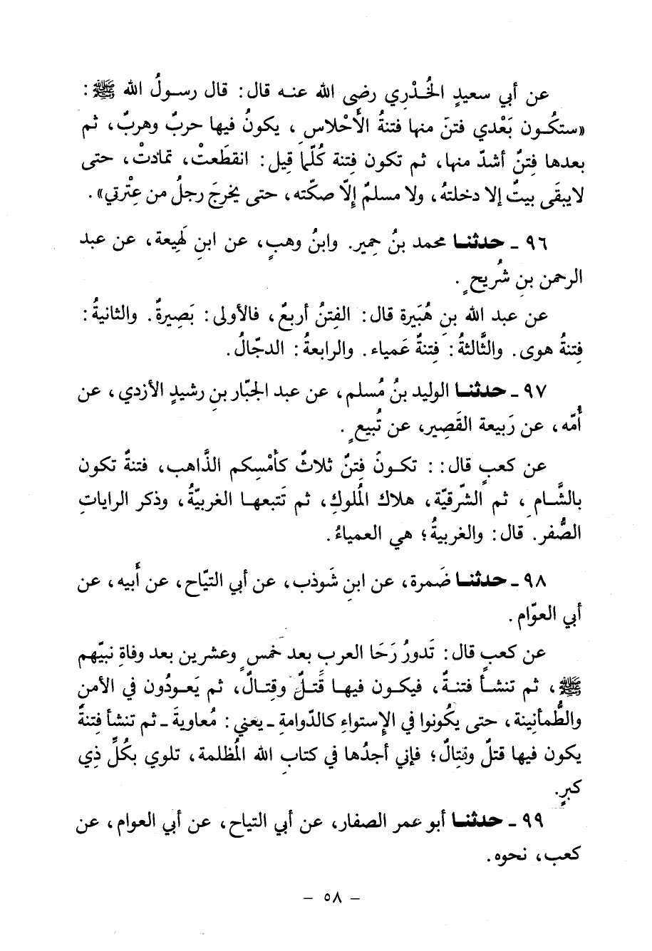 96 - حَدَّثَنَا مُحَمَّدُ بْنُ حِمْيَرَ، وَابْنُ وَهْبٍ عَنِ ابْنِ لَهِيعَةَ، عَنْ عَبْدِ الرَّحْمَنِ بْنِ شُرَيْحٍ، عَنْ عَبْدِ اللَّهِ بْنِ هُبَيْرَةَ، قَالَ: «§الْفِتَنُ أَرْبَعٌ، فَالْأُولَى بَصِيرَةٌ، وَالثَّانِيَةُ فِتْنَةُ هَوَاءٍ، وَالثَّالِثَةُ فِتْنَةٌ عَمْيَاءُ، وَالرَّابِعَةُ الدَّجَّالُ»