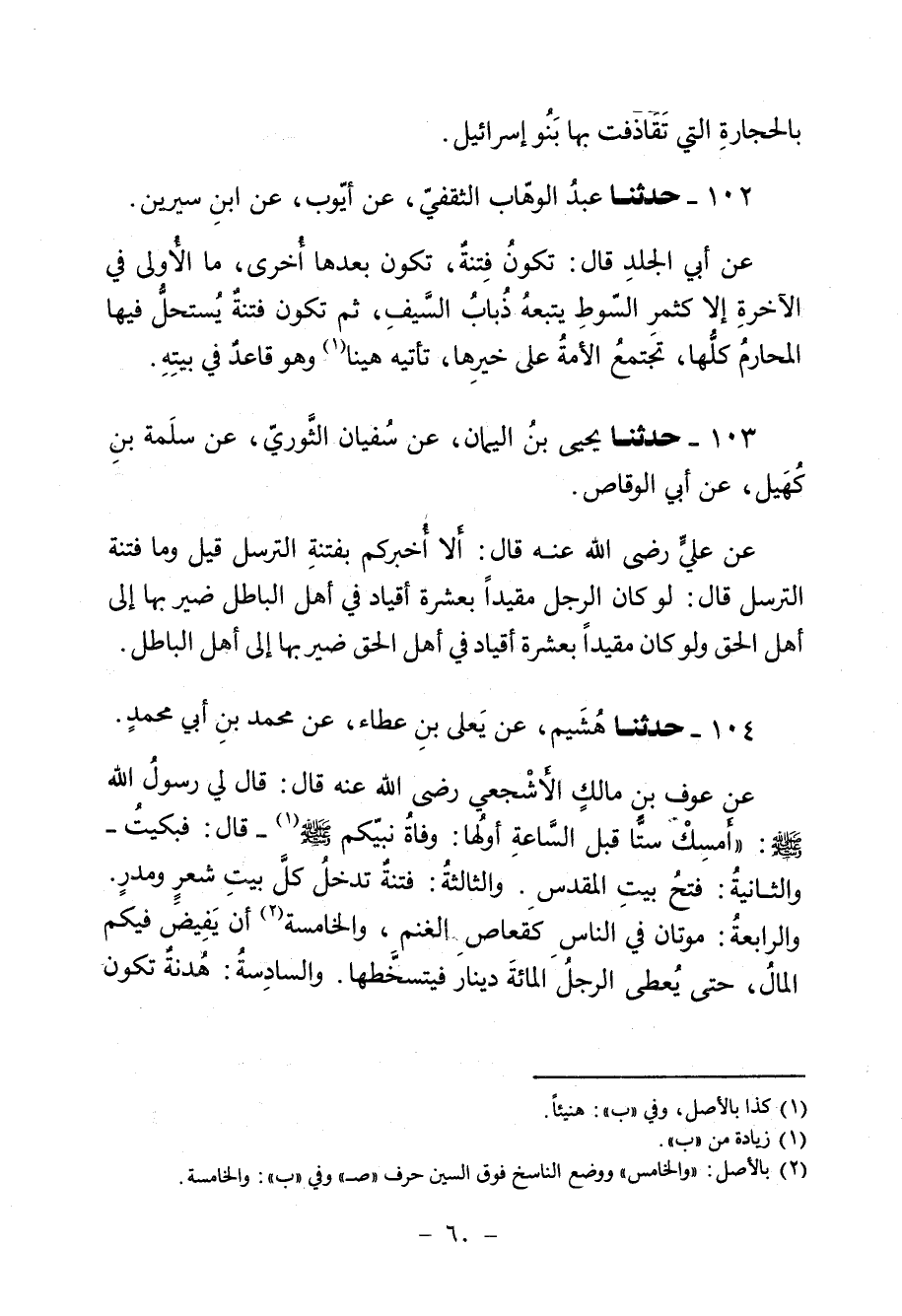104 - حَدَّثَنَا هُشَيْمٌ، عَنْ يَعْلَى بْنِ عَطَاءٍ، عَنْ مُحَمَّدِ بْنِ أَبِي مُحَمَّدٍ، عَنْ عَوْفِ بْنِ مَالِكٍ الْأَشْجَعِيِّ، رَضِيَ اللَّهُ عَنْهُ قَالَ: قَالَ لِي رَسُولُ اللَّهِ صَلَّى اللهُ عَلَيْهِ وَسَلَّمَ: «§أَمْسِكْ سِتًّا قَبْلَ السَّاعَةِ، أَوَّلُهَا وَفَاةُ نَبِيِّكُمْ» قَالَ: فَبَكَيْتُ، «وَالثَّانِيَةُ فَتْحُ بَيْتِ الْمَقْدِسِ، وَالثَّالِثَةُ فِتْنَةٌ تَدْخُلُ كُلَّ بَيْتٍ شَعْرٍ وَمَدَرٍ، وَالرَّابِعَةُ مَوَتَانٌ فِي النَّاسِ كَقُعَاصِ الْغَنَمِ، وَالْخَامِسُ أَنْ يَفِيضَ فِيكُمُ الْمَالُ حَتَّى يُعْطَى الرَّجُلُ الْمِائَةَ دِينَارٍ فَيَتَسَخَّطَهَا، وَالسَّادِسَةُ هُدْنَةٌ تَكُونُ -[61]- بَيْنَكُمْ وَبَيْنَ بَنِي الْأَصْفَرِ فَيَسِيرُونَ إِلَيْكُمْ فِي ثَمَانِينَ رَايَةً، تَحْتَ كُلِّ رَايَةٍ اثْنَا عَشَرَ أَلْفًا»