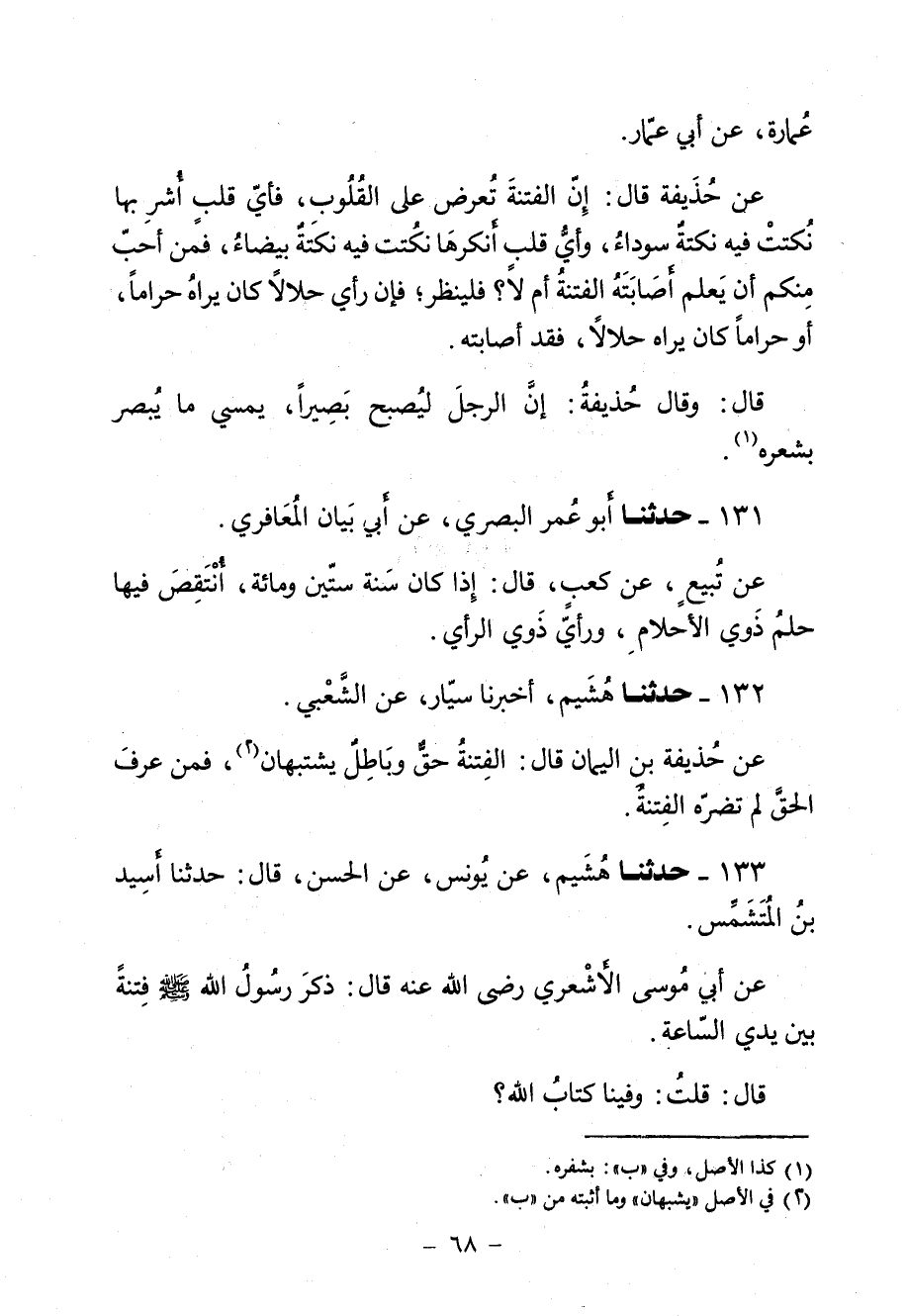 132 - حَدَّثَنَا هُشَيْمٌ، أَنَا سَيَّارٌ، عَنِ الشَّعْبِيِّ، عَنْ حُذَيْفَةَ بْنِ الْيَمَانِ، قَالَ: «§الْفِتْنَةُ حَقٌّ وَبَاطِلٌ يَشْتَبِهَانَ، فَمَنْ عَرَفَ الْحَقَّ لَمْ تَضُرَّهُ الْفِتْنَةُ»