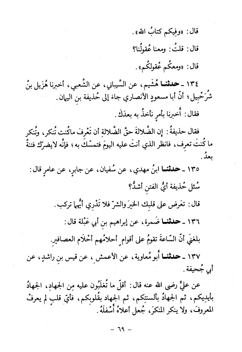 134 - حَدَّثَنَا هُشَيْمٌ، عَنِ الشَّيْبَانِيِّ، عَنِ الشَّعْبِيِّ، أَنَا هُزَيْلُ بْنُ شُرَحْبِيلَ، أَنَّ أَبَا مَسْعُودٍ الْأَنْصَارِيَّ، جَاءَ إِلَى حُذَيْفَةَ بْنِ الْيَمَانِ فَقَالَ: أَخْبِرْنَا بِأَمْرٍ نَأْخُذُ بِهِ بَعْدَكَ، فَقَالَ حُذَيْفَةُ «إِنَّ §الضَّلَالَةَ حَقَّ الضَّلَالَةِ أَنْ تَعْرِفَ مَا كُنْتَ تُنْكِرُ، وَتُنْكِرَ مَا كُنْتَ تَعْرِفُ، فَانْظُرِ الَّذِي أَنْتَ عَلَيْهِ الْيَوْمَ فَتَمَسَّكْ بِهِ، فَإِنَّهُ لَا يَضُرُّكُ فِتْنَةٌ بَعْدُ»