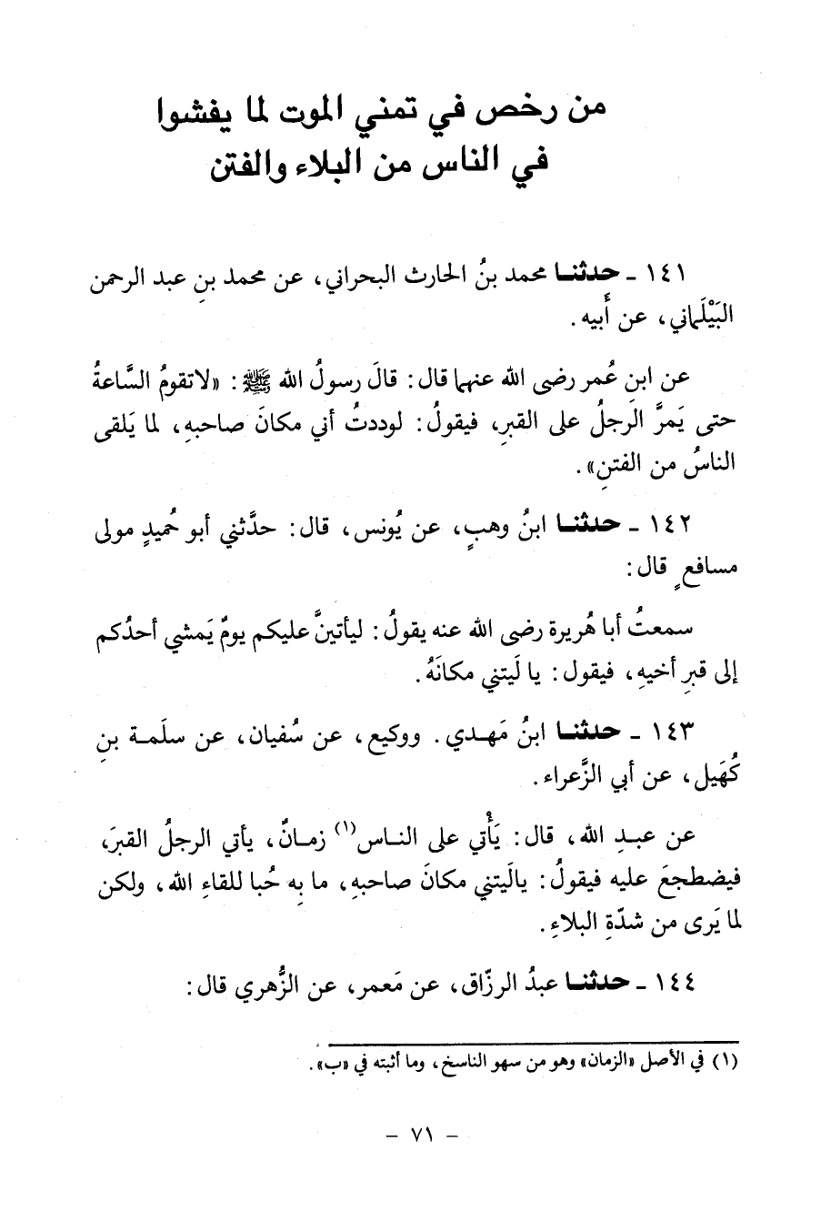 141 - حَدَّثَنَا مُحَمَّدُ بْنُ الْحَارِثِ الْبَحْرَانِيُّ، عَنْ مُحَمَّدِ بْنِ عَبْدِ الرَّحْمَنِ الْبَيْلَمَانِيُّ، عَنْ أَبِيهِ، عَنِ ابْنِ عُمَرَ، رَضِيَ اللَّهُ عَنْهُمَا قَالَ: قَالَ رَسُولُ اللَّهِ صَلَّى اللهُ عَلَيْهِ وَسَلَّمَ: " §لَا تَقُومُ السَّاعَةُ حَتَّى يَمُرَّ الرَّجُلُ عَلَى الْقَبْرِ فَيَقُولُ: لَوَدِدْتُ أَنِّي مَكَانَ صَاحِبِهِ لِمَا يَلْقَى النَّاسُ مِنَ الْفِتَنِ "