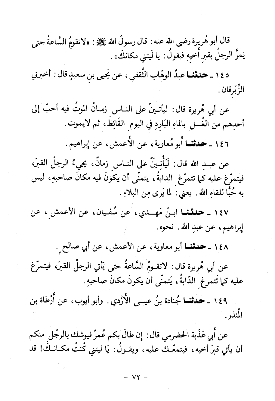 148 - حَدَّثَنَا أَبُو مُعَاوِيَةَ، عَنِ الْأَعْمَشِ، عَنْ أَبِي صَالِحٍ، عَنْ أَبِي هُرَيْرَةَ، قَالَ: «§لَا تَقُومُ السَّاعَةُ حَتَّى يَأْتِيَ الرَّجُلُ الْقَبْرَ فَيَتَمَرَّغَ عَلَيْهِ كَمَا تَتَمَرَّغُ الدَّابَّةُ، يَتَمَنَّى أَنْ يَكُونَ مَكَانَ صَاحِبِهِ»